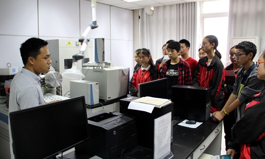 随后,在段海静、阮心玲两位老师的带领下,同学们参观了环境科学实验室。实验室内认真实验的学生、一台台先进的实验仪器,使他们进一步了解了实验工作,激发了其对科研的兴趣。在学院顶楼的天文台处,硕大的折反射式望远镜引起了同学们的强烈关注,使得他们驻足在此,有同学拿出手机拍摄、录像,记录下这令人振奋的参观旅途。许立民老师为他们讲解了折反射式望远镜的构造特点、使用方法等,风趣幽默、通俗易懂的讲解风格时不时引来阵阵笑声,让同学们在欢乐之余加深了对天文学科的热爱。