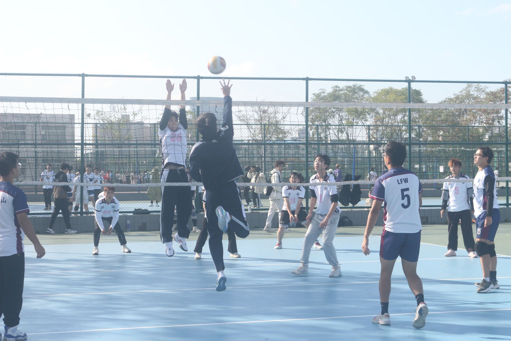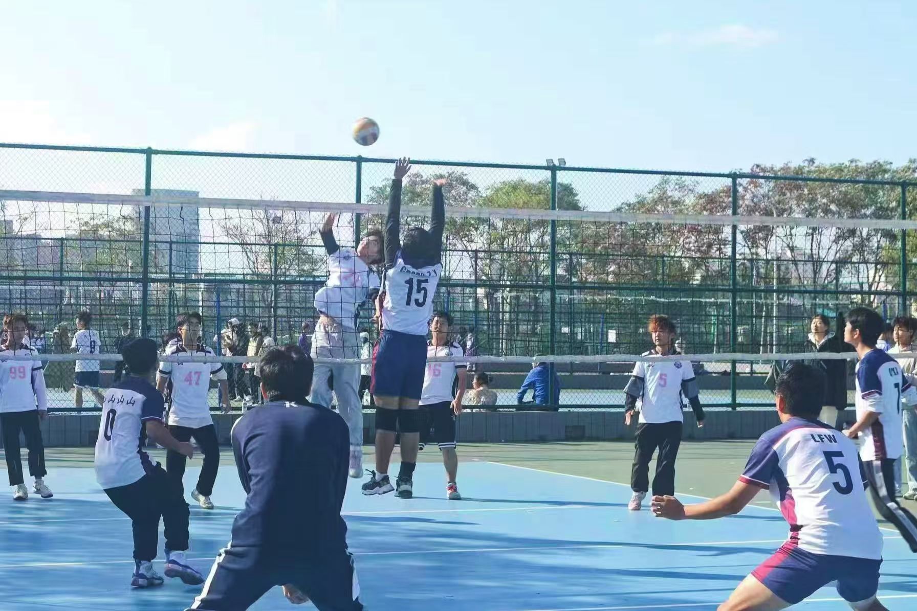 对阵外语学院时,我院球员目光坚定,将球高高抛起后用力一击,展现出色的发球技巧。他们反应迅速,配合默契,将球稳稳垫起,组织一次有效反攻。双方你来我往,比分交替上升,比赛气氛紧张而激烈。尽管对手凭借强劲的攻势和严密的防守占据优势,但我院球队并未气馁,迅速调整状态,加强发球和拦网,凭借灵活的战术和多变的进攻方式逐渐追平比分。场上队员奋力拼搏,每一次扣杀、每一次拦网都充满了力量与技巧。观众们紧张地注视着比赛进程,加油声此起彼伏,为选手们的每次精彩表现欢呼。最终,我院以2:0的比分获胜外语学院。但在小组赛阶段的其他比赛中,我院以0:2的比分不敌建筑工程学院,以1:2的比分不敌教育学部,无缘出线。