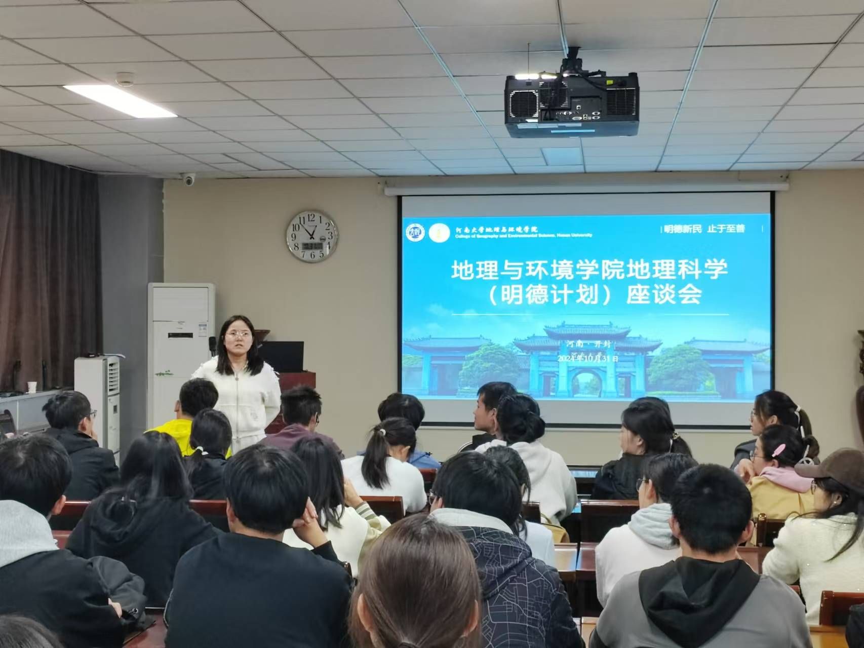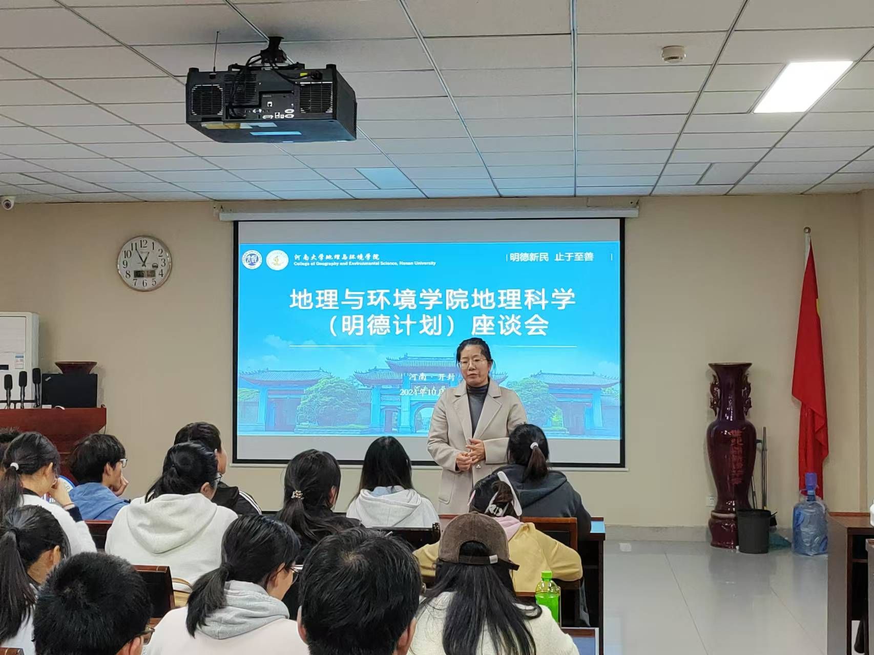 为促进我院人才培养,增强学生的创新能力,10月31日下午,我院于地学楼二楼学术报告厅召开2022级、2023级地理科学(明德计划)班座谈会。学院副院长丁志伟,团委书记赵越,2022级、2023级辅导员马利群、屈利铭出席此次座谈会,我院2022级、2023级地理科学(明德计划)班全体学生参与。