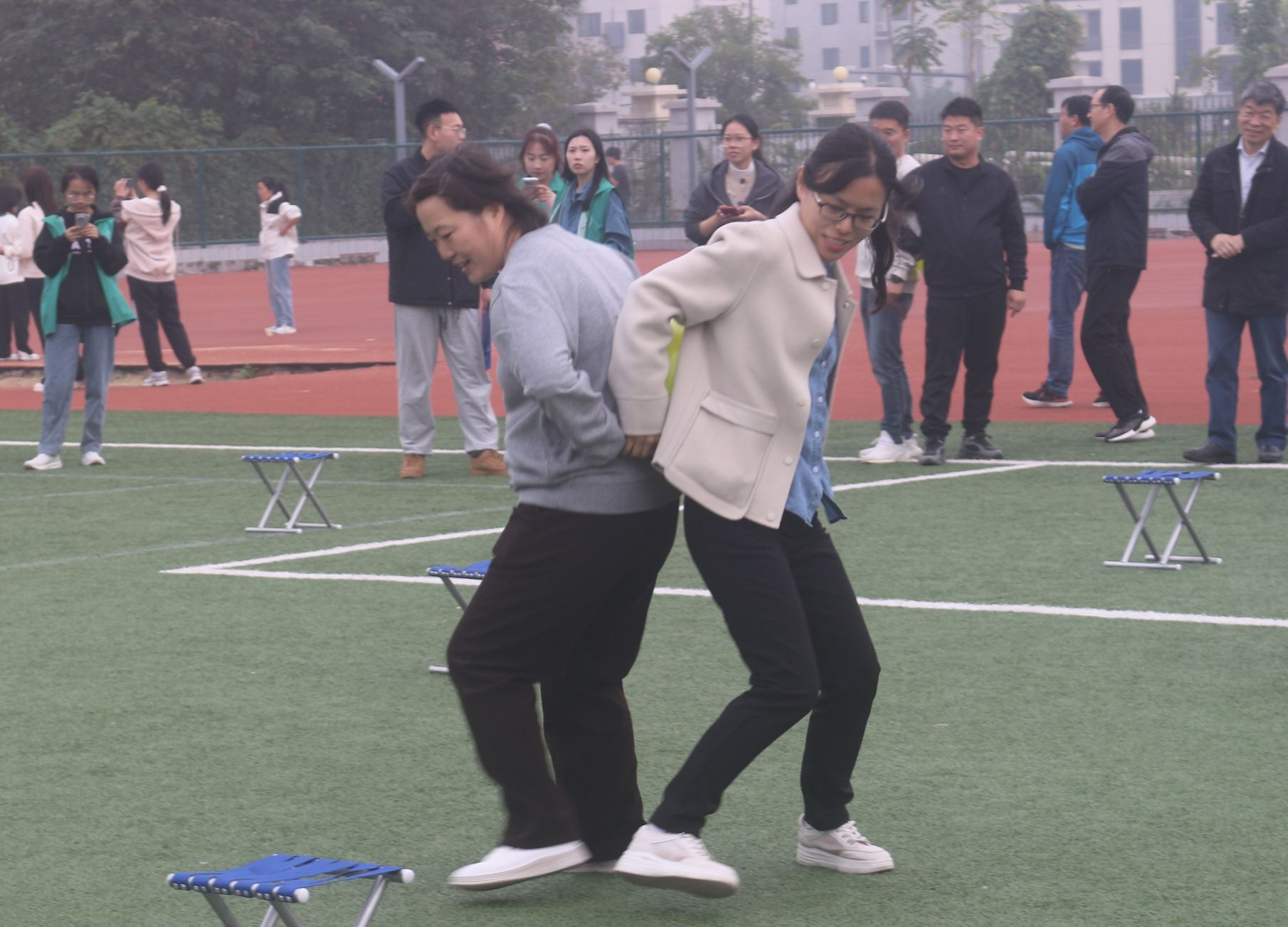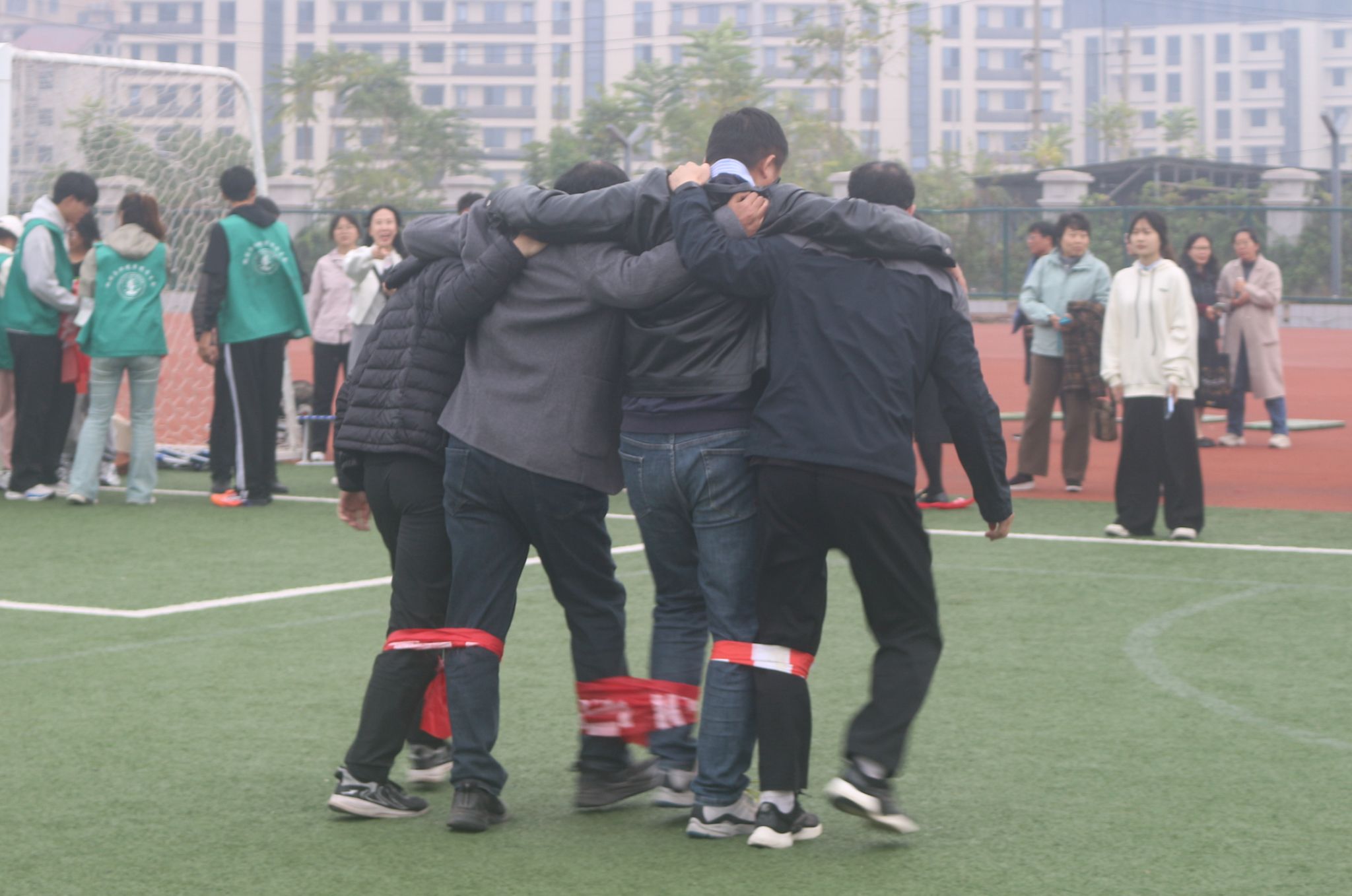 在教职工趣味运动会中,四人五足无疑是最具有欢乐氛围的项目之一。随着一声清脆的哨响,比赛正式拉开帷幕。平日里沉稳庄重的教师们瞬间变身成为赛场上活力四射的运动员。“一二、一二……”整齐的口号声在操场上空回荡,教师们的身体微微前倾,手臂紧紧地搭在彼此的肩上,每一步都迈得坚定有力,每个人的脸上都洋溢着兴奋的神情。足球传递活动中,教师们身姿矫健、配合默契,通过一个眼神、一个手势的默契交流,巧妙地控制着足球的方向。旁边的观众也被他们的激情所感染,不断为他们呐喊助威,气氛热烈而欢快。