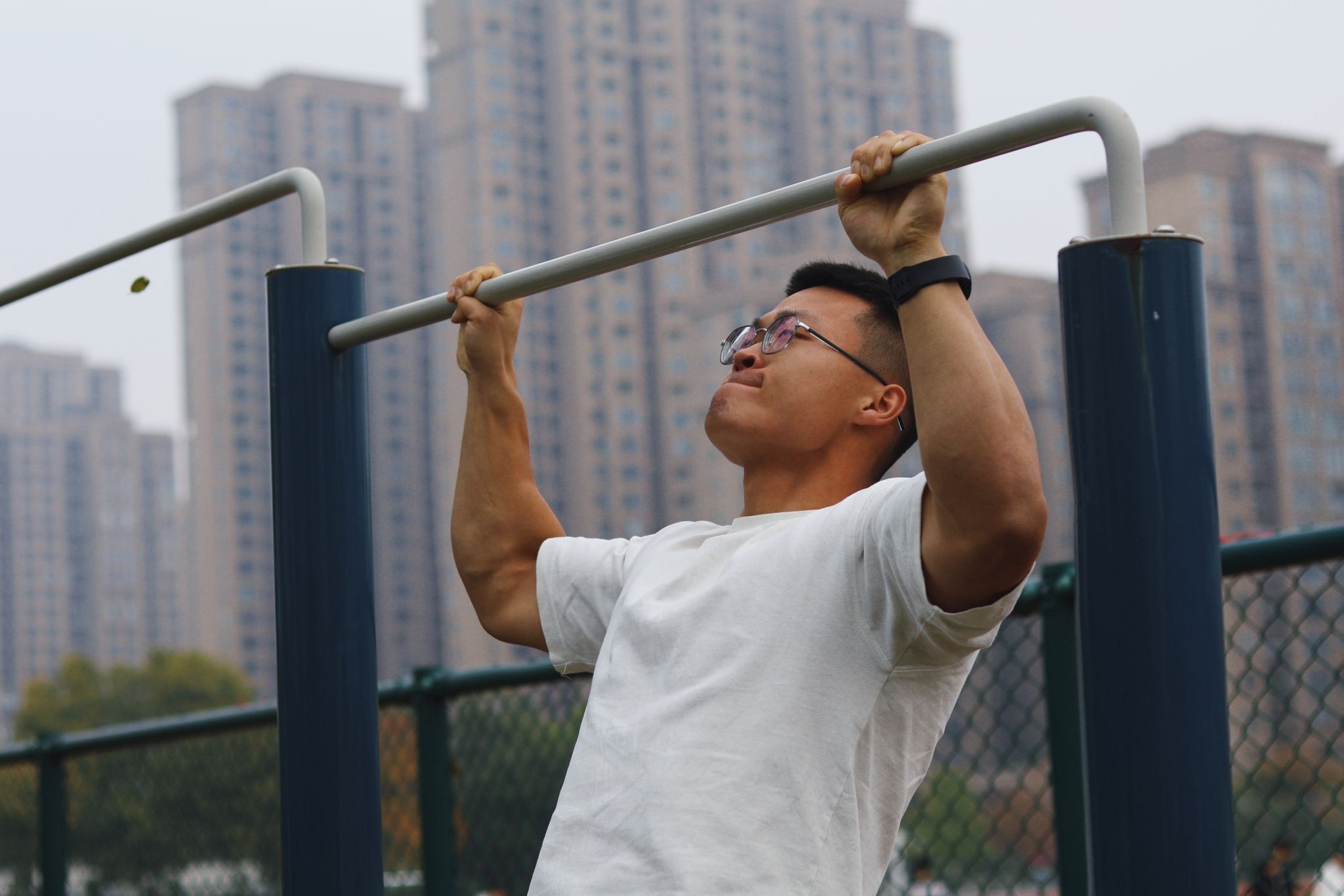 “加油,加油!”引体向上的选手们在如雷般的喝彩声中奋力向上拉起身体,那手臂上的肌肉瞬间紧绷得如同钢铁一般,青筋也根根微微凸起,好似要挣破皮肤。每一次的拉起都宛如一场与重力的激烈角斗,他们的身体在空中有节奏地微微摆动,淋漓尽致地展现出力量与重力的完美结合,仿佛整个世界都为之沸腾,让人充分感受到引体向上的激情澎湃。