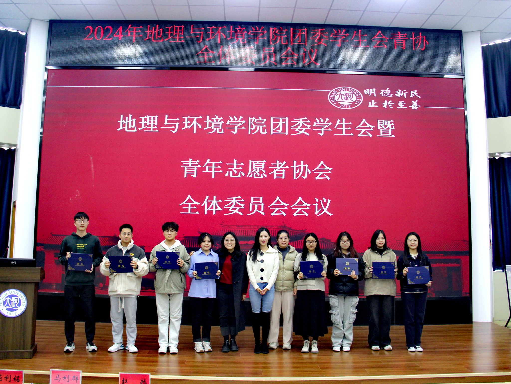 会上,赵越为2023届团委学生会主席团与青年志愿者协会会长层成员颁发荣誉证书并拍照留念,赵越、马利群、屈利铭和2024届团委学生会主席团与青年志愿者协会会长层拍照留念。随后,我院2023届团委副书记(学生兼职)刘晓宁、2024届团委副书记李金峰、2024届青年志愿者协会会长陆福强依次发表讲话。他们期待新一届成员能够继续勇往直前,迎接挑战,做出更出彩的成绩。我院团委学生会及青年志愿者协会各部门部长也就各自部门的职务及成员进行简单介绍。最后,社团代表、粤语协会副会长左可成与球队代表刘媛媛依次发言,展示了社团和球队对于学院文化建设的重要作用。