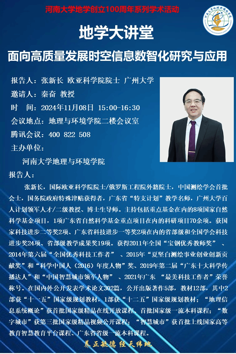张新长,国际欧亚科学院院士/俄罗斯工程院外籍院士,中国测绘学会首批会士,国务院政府特殊津贴获得者,广东省“特支计划”教学名师,广州大学百人计划领军人才/二级教授、博士生导师。主持包括重点基金在内的8项国家自然科学基金项目,1项广东省自然科学基金重点项目在内的科研项目70余项。获国家科技进步奖二等奖2项、广东省科技进步奖一等奖2项在内的省部级和全国学会科技进步奖24项、省部级教学成果奖19项。获得2011年全国“宝钢优秀教师奖” 、2014年第六届“全国优秀科技工作者” 、2015年“夏坚白测绘事业创业创新贡献奖”和“科学中国人(2016)年度人物”奖、2019年第二届“广东十大科学传播达人”和“中国智慧城市领军人物” 、2021年广东 “最美科技工作者”荣誉称号。在国内外公开发表学术论文302篇,公开出版著作5部,教材12部,其中2部获“十一五”国家级规划教材,1部获“十二五”国家级规划教材;“地理信息系统概论”获首批国家级精品在线开放课程、首批国家级一流本科课程;“数字城市”获第三批国家级精品视频公开课程;“智慧城市”获首批上线国家高等教育智慧教育平台课程、广东省省级一流本科课程。