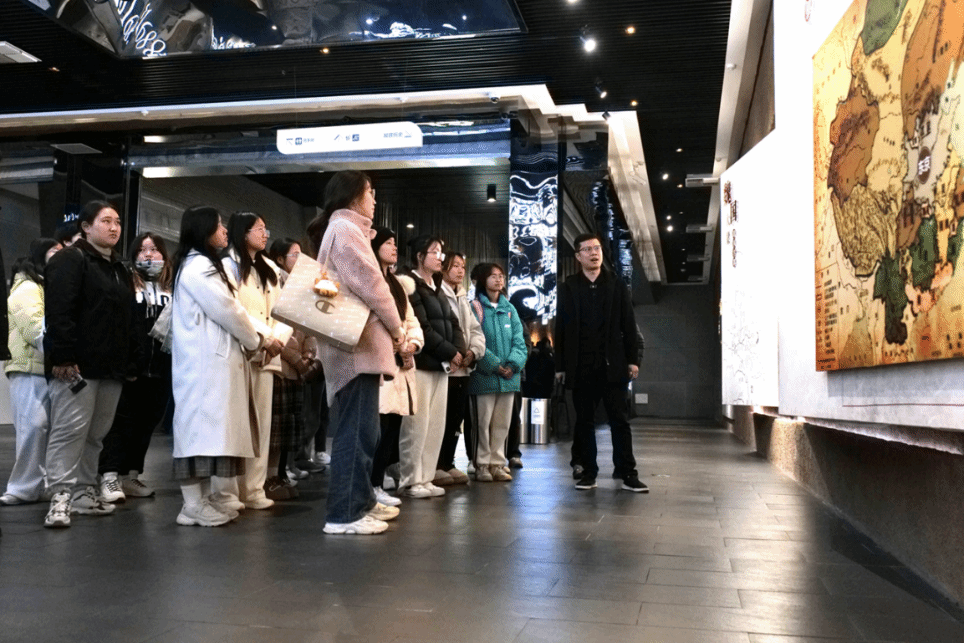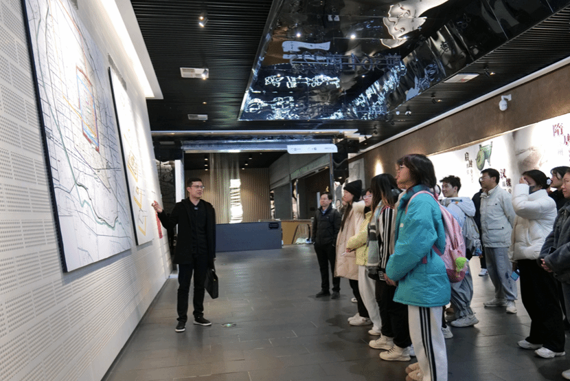 此次活动主要围绕开封市的历史沿革、城市规划等多个方面展开。进入展馆,绘有汴京八景的帷幕缓缓展开,根据展览设置,首先通过视频宣传片的形式展示了开封市的整体概况,深化了学生对开封市的城市印象。进入展示馆二楼,在杨阳的带领和讲解下,学生在“八朝古都”专项展览中深入梳理了开封市的历史脉络。馆内魏国大梁、隋唐汴州等历朝历代的基本资料悉数展开,与各类城址地图交相辉映,图文详实,让学生们能够深刻地感受到开封市深厚的历史积淀和建城历史。