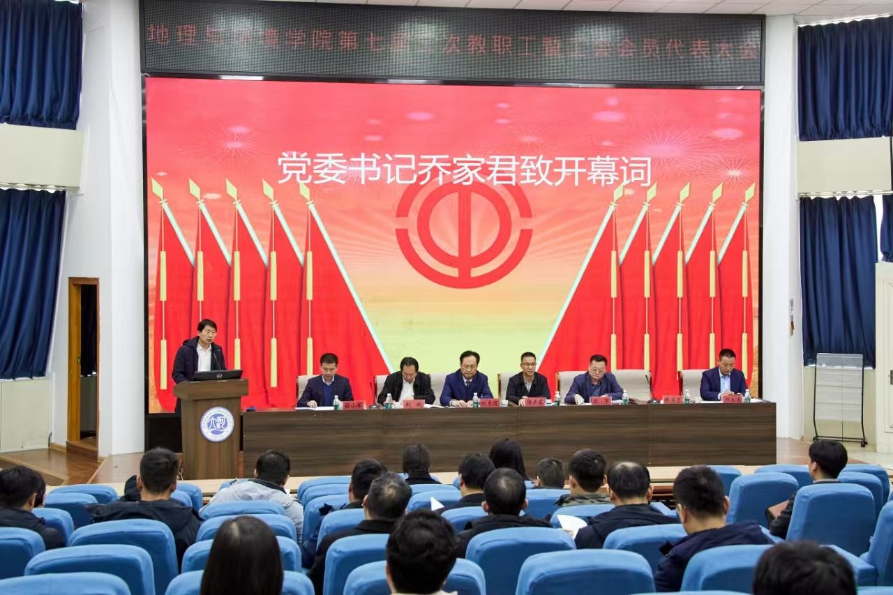 会议在激昂雄浑的国歌声中拉开帷幕。地理与环境学院党委书记乔家君致开幕词,他向全体教职工和工会成员致以诚挚问候。他对学院自七届二次教职工暨工会会员代表大会以来所取得的丰硕成果与可喜成绩给予了充分肯定和高度赞扬,并代表学院向第七届工会委员及全体教职工表示衷心感谢。