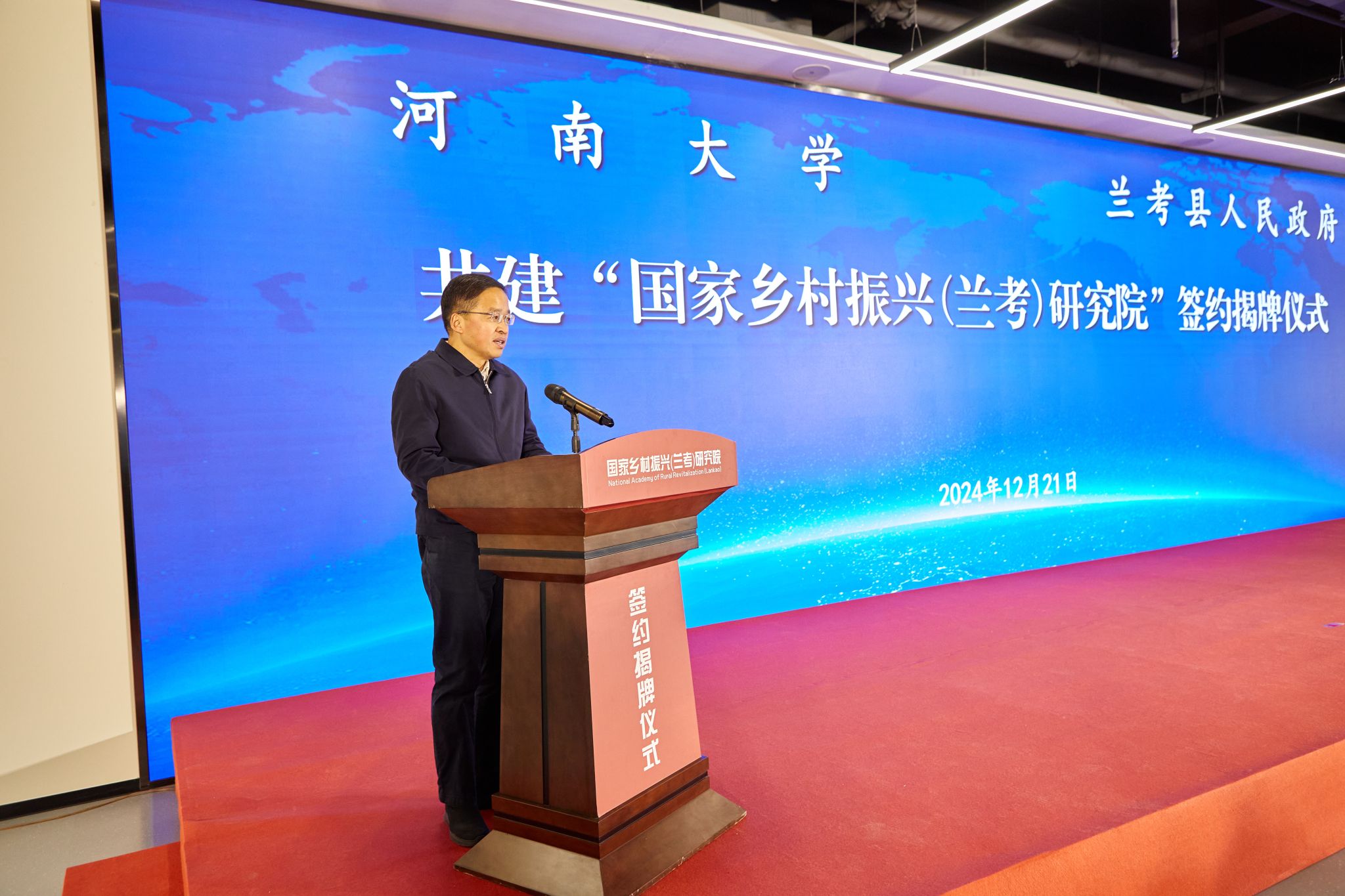 副主任、教育部人文社科重点研究基地黄河文明与可持续发展研究中心主任苗长虹与兰考县委常委、常务副县长张卫波分别代表双方签约。刘彦随与陈维忠共同为国家乡村振兴(兰考)研究院揭牌。