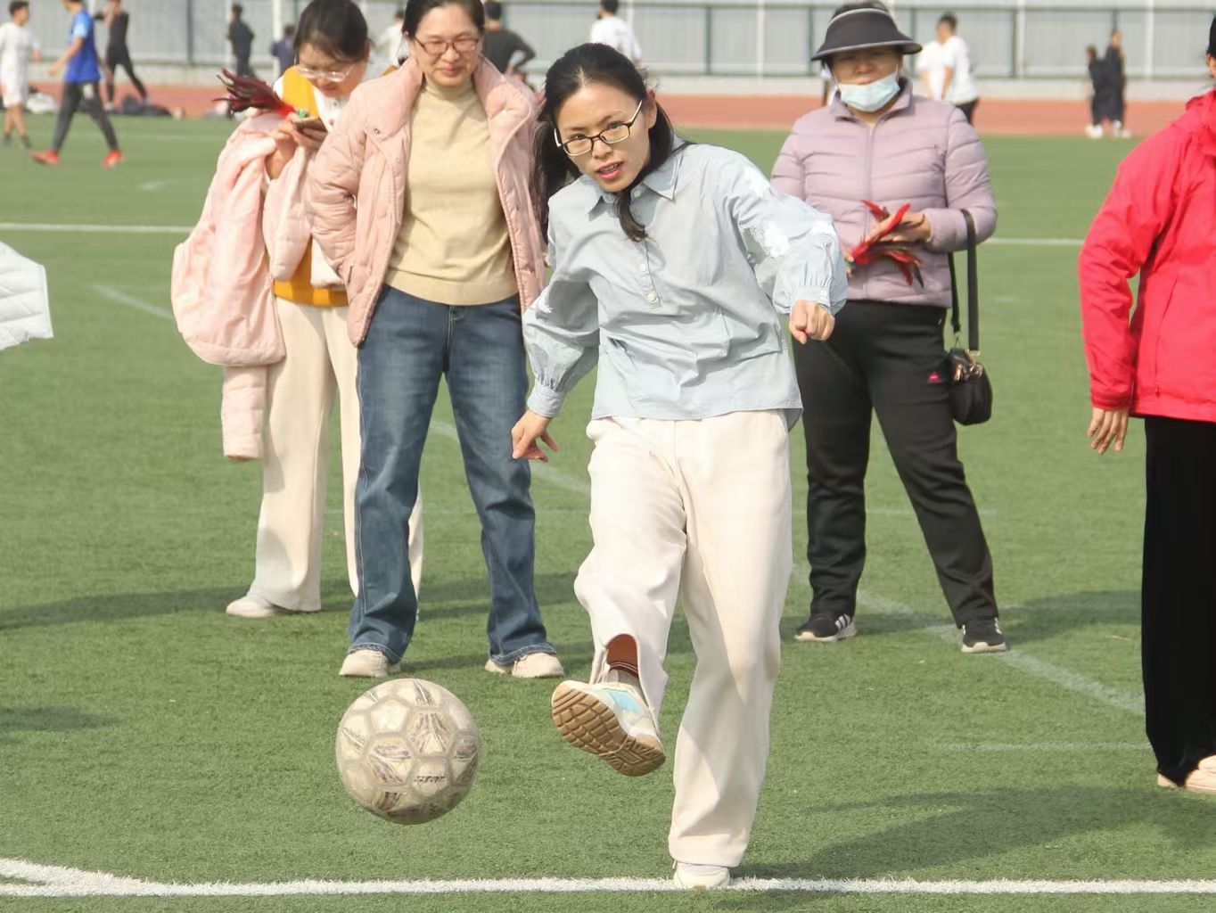 在“赶猪入栏”比赛项目中,教师们手持木质长杆,躬身如满弦之弓,附身待发。随着发令声响,足球在杆头灵活的拨动下蛇形穿梭,巧妙绕过重重障碍。当首棒教师顺利归栏后,接力教师迅速接过木杆返程,发丝飞扬间尽显矫健身姿。赛道旁“注意节奏!”“稳住方向!”的呐喊此起彼伏。当末棒教师携球冲过终点线,他们汗湿的额角与灿烂笑颜交相辉映,充分展现出团队协作的魅力。足式保龄球项目的赛场同样精彩。教师们目光如炬,或屈膝蓄力、或侧身摆腿,跃跃欲试。场边观众随着足球轨迹屏息凝神,每当“嘭”的一声脆响,水瓶应声而倒,全场喝彩声似汹涌浪潮,澎湃而起,将现场气氛烘托得热烈非凡。在随后的沙包背抛项目中,教师们提前进行了适应性训练。只见他们手臂一挥,沙包自背后抛出,在空中划出一道道优美的抛物线,稳稳落在目标区域内,赢得了全场观众的掌声。压轴的跳长绳项目将活动气氛推向顶点。长绳在摇绳者们默契的圆弧轨迹中翻飞起舞,参赛教师们全神贯注,看准节奏轻盈跃入。受现场热烈气氛感染,学生们纷纷响应教师邀请加入跳绳行列。跃动的身影既展现了师生们的运动活力,又在协作配合中加深了彼此默契,拉近了心灵上的距离。经过激烈的角逐,最终“行政”工会小组摘得桂冠。