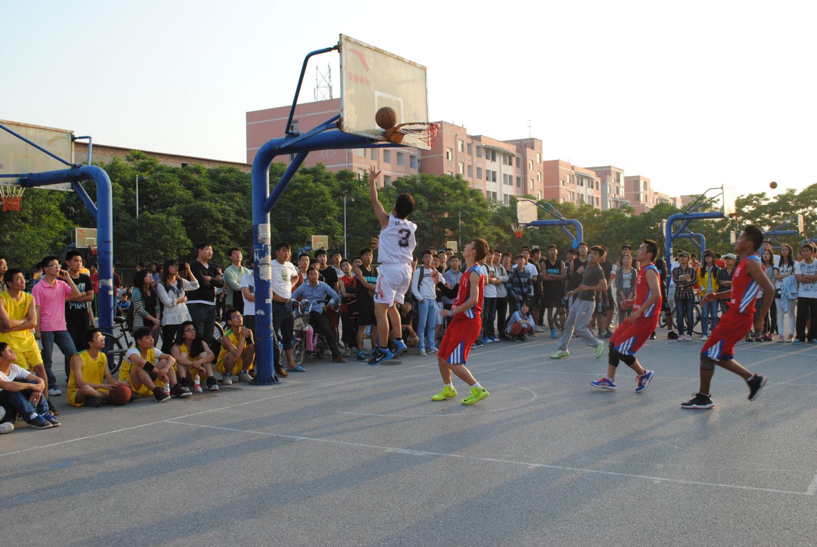 环境与规划学院篮球队、排球队首场分别对阵经济学院、土木建筑学院。赛场上人头攒动,欢腾一片。