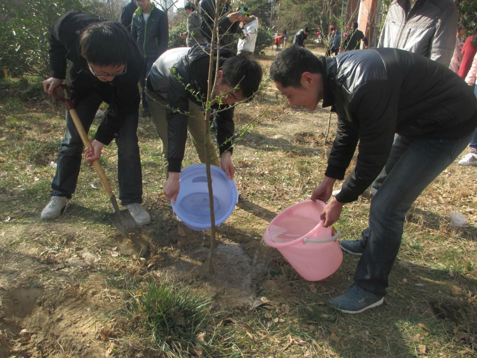 下午三时,在学院团委副书记宋永鹏和2011级辅导员元媛老师的带领下,同学们开展了植树活动。大家热情高涨,分工合作,挖土、植树、浇水,一项项工作伴随着同学们的欢声笑语有条不紊的进行着。植树过程中,元媛老师对我们的活动给予了高度评价,认为此项活动是一项极其有意义的活动,美化了校园,提高了大家的动手能力,且具有一定的纪念意义。此次活动也引起了热烈反响,吸引了不少路人驻足观看,还有同学主动前来帮忙。最后大家进行了后期管理工作的分配,并合影留念。