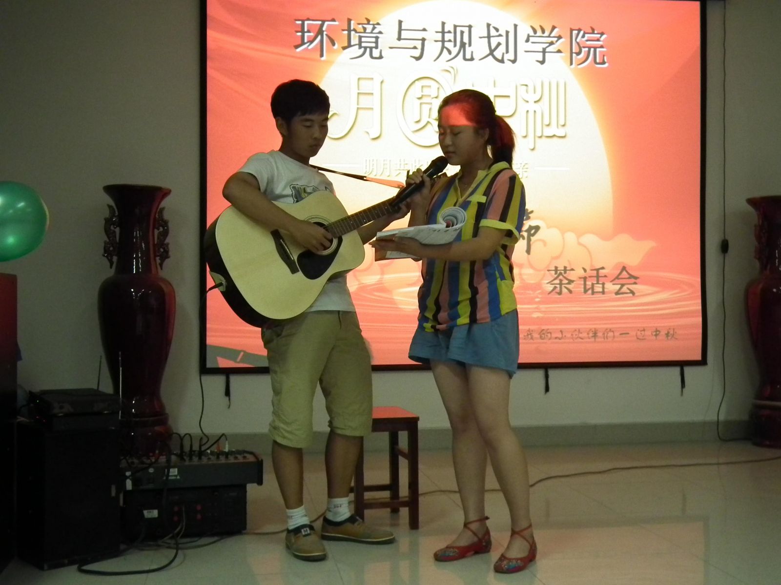本次茶话会以“明月共此时 和谐一家亲”为主题,分“讲述月饼来历”,“击鼓传花”,“即兴表演”三个环节。辅导员宋国庆老师首先致了开场白。幽默风趣的讲话让会场气氛好不温馨热闹。他鼓励同学们积极参与此类活动,来展示自己,同时加强相互间的沟通交流,提高语言表达能力,为以后的工作和学习打下基础。茶话会过程中,大家坐在一起猜灯谜、唱歌、做游戏,像兄弟姐妹般亲切欢愉。此外,团委副书记郭鹏飞也对参加此次茶话会的新生们表达了热烈的欢迎和真挚的祝福。他说:希望本次茶话会可以让中秋没有回家的学弟学妹们一样有在家过中秋的感觉,有一样的幸福与欢乐。