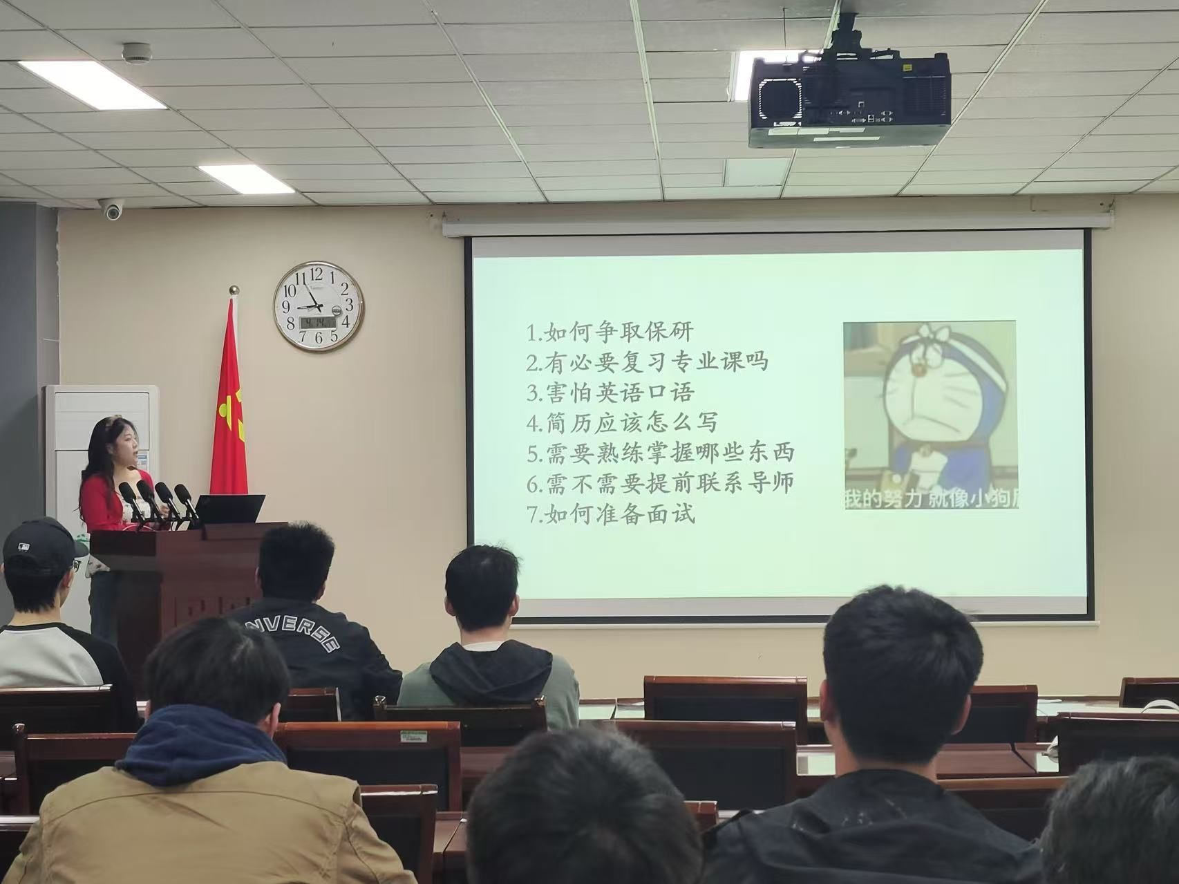 会议伊始,丁志伟对2021级参会学生的升学喜讯表示祝贺并基于自身作为研究生导师的心得感悟向学生们分享了三点经验。他表示,学生在规划读研路径时需秉持对目标院校的诚挚追求,坚守科研初心;同时应保持恒心毅力,持续提升专业能力;此外还要调整心态,以平稳心境适应新环境挑战。他强调备考阶段需全面规划,精准把握复试要点,凭借扎实科研积累和专业基础迎接学术进阶考验。随后,杨姝汀从院校选择、备考计划、学习攻略等方面进行考验经验分享。她认为择校作为方向性决策,需综合个人兴趣、职业规划与学科排名审慎抉择。在备考实操层面,建议学生提前搜集各科目资料,具体而言:政治可依托线上题库强化训练,英语着重提升阅读理解能力,数学需筑牢基础体系,专业课则应多方搜集信息构建知识框架,从而实现科学备考与能力进阶的有机统一。