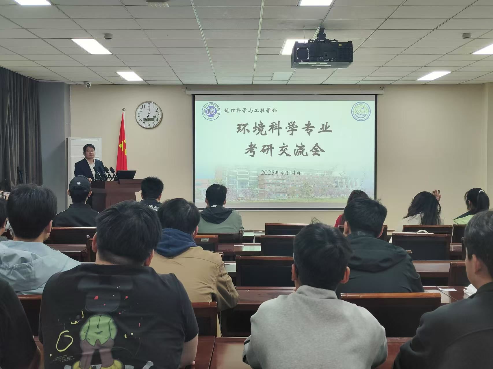 环境科学系于地学楼二楼学术报告厅开展考研交流会,学院副院长丁志伟受邀参会并作讲话,学院2021级本科生杨姝汀、卢星宇、胡文煊、毕子钧、熊峰、李茜、杨镓旺、王柯岩和郎显赫积极分享升学经验,2022级和2023级环境科学专业学生参会学习,会议由环境科学专业教师李涛主持。