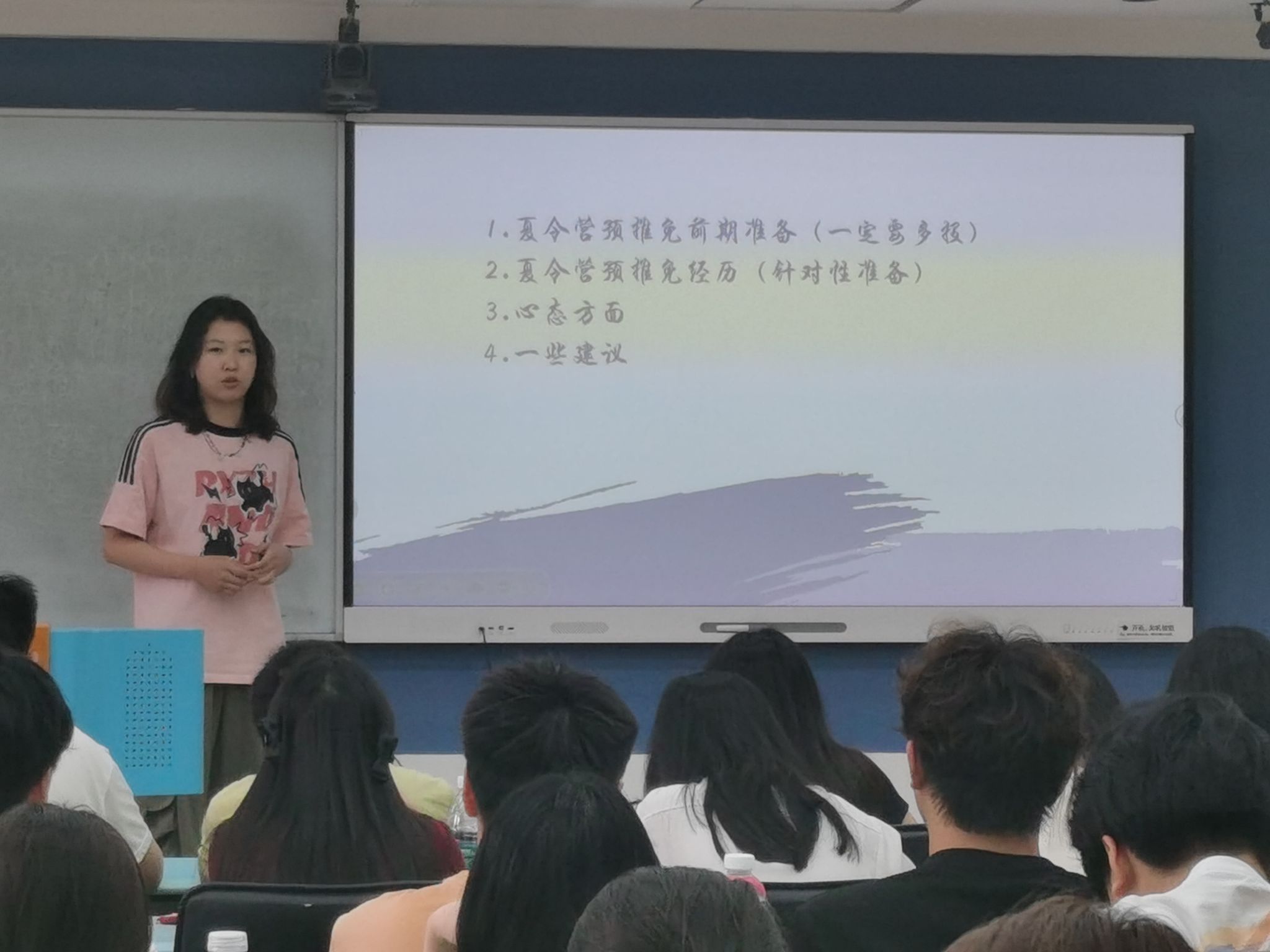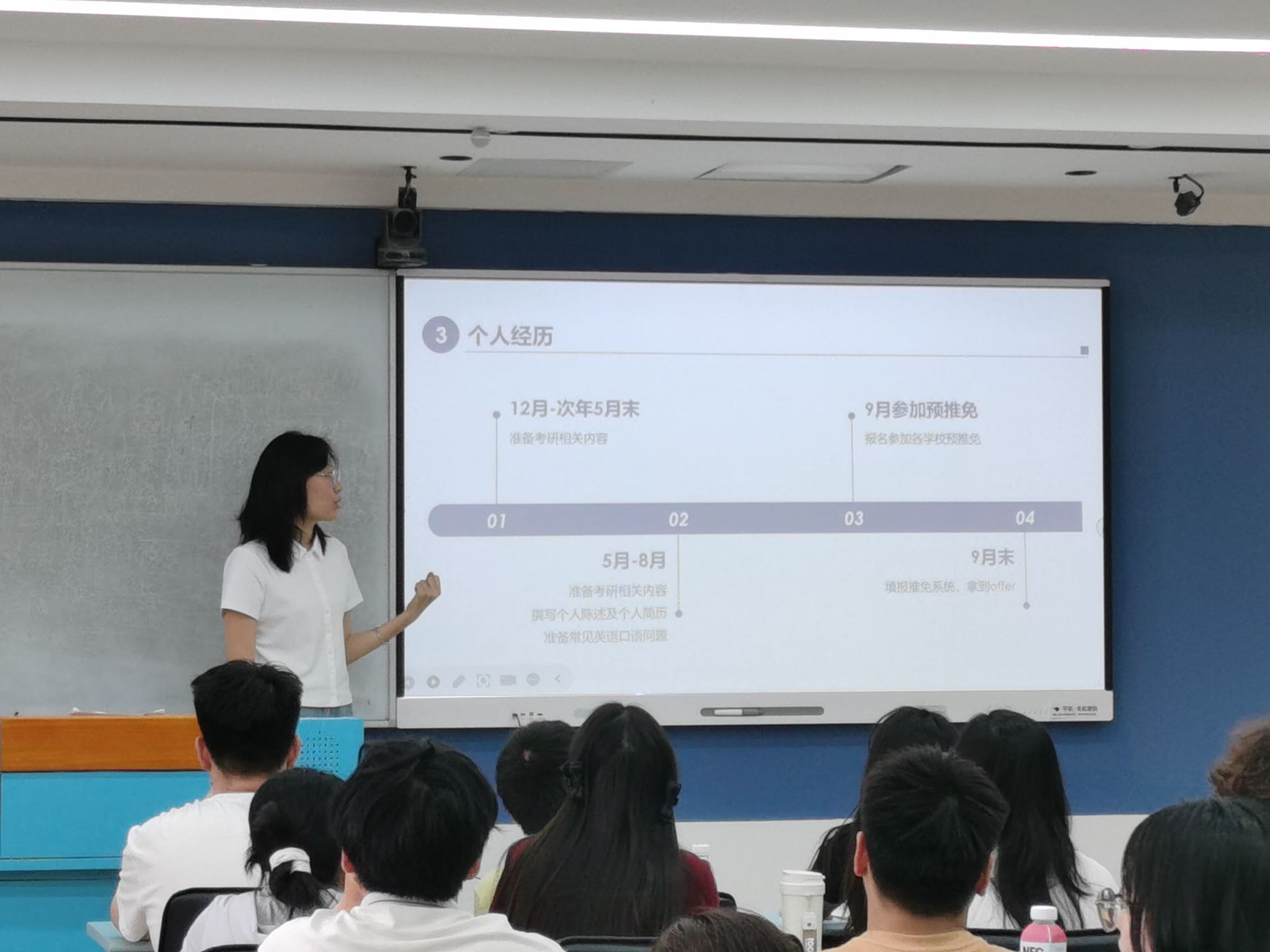 保研经验分享组,王政阳特别强调专业成绩的竞争优势,分享了论文发表在助力保研过程中的重要性;张佳诺揭秘“保研黄金时间窗”运作机制,建议从大二寒假启动文书打磨,同时强调提升英语水平、参与科研或竞赛的重要性;殷佳洁以自身经历印证“长线备战”价值,分享在错失夏令营机会后,凭借专业素养与综合实力成功保研的实战经验。