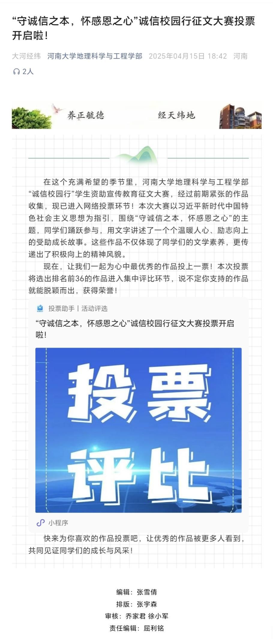 ”微信公众号对征集到的作品进行了线上展示投票。一篇篇真实感人的文字传递着受助学生积极向上的成长力量,也让更多人感受到“资助育人”政策背后的温度与关怀。