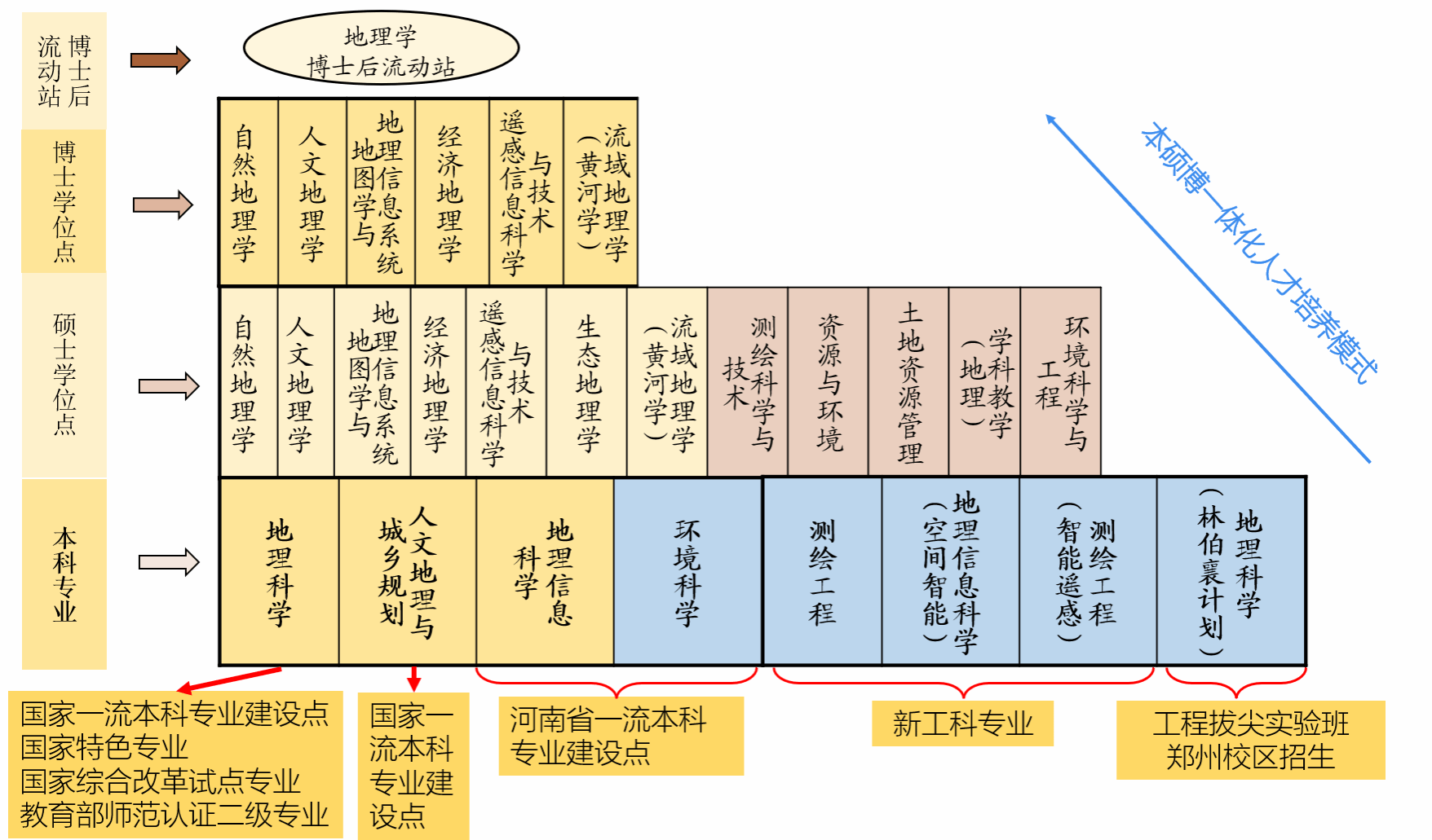 在学科建设方面,拥有地理学一级学科博士学位点和博士后科研流动站,下设自然地理学、人文地理学、地图学与地理信息系统、经济地理学、生态地理学、遥感信息科学与技术6个二级学科方向;设有测绘科学与技术、环境科学与工程、资源与环境3个一级学科硕士点;拥有地理科学、人文地理与城乡规划、地理信息科学、环境科学、测绘工程5个本科专业,地理信息科学(空间智能)、测绘工程(遥感智能)2个特色方向专业,地理科学(林伯襄计划)景兰工程实验班。