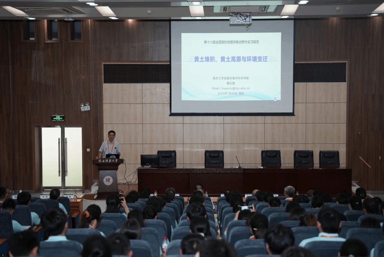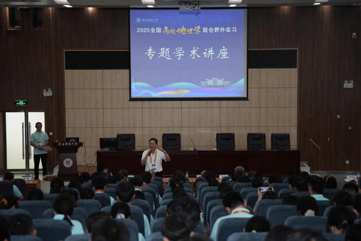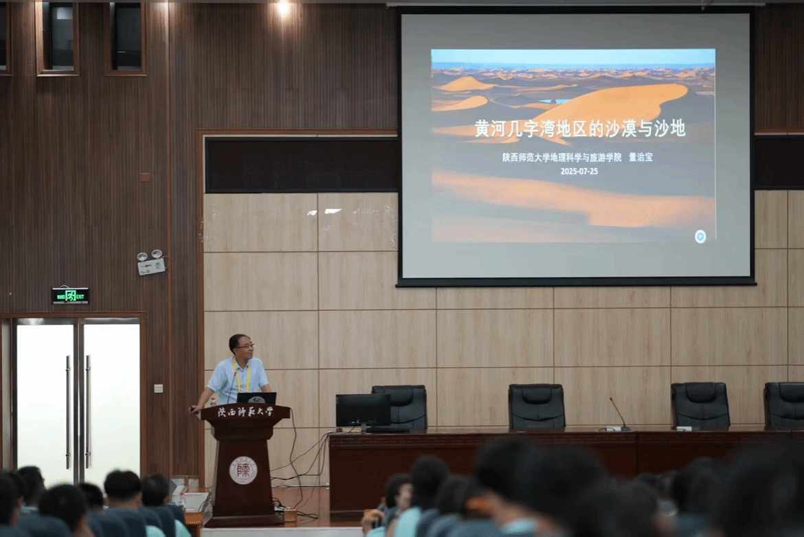 上午10:00,在陕西师范大学地理科学与旅游学院副院长焦磊的主持下,三位教授分享了精彩的报告。南京大学鹿化煜教授以《黄土堆积、黄土高原与环境变迁》为题,剖析黄土与高原环境的奇妙关联;陕西师范大学董治宝教授以《黄河几字弯沙漠与沙地》为题,探寻黄河沿岸沙域奥秘;西北大学宋进喜教授以《黄河流域水-生-人系统协调与可持续发展》为题,洞察流域可持续发展密码。三位教授的报告高屋建瓴,兼具学术深度与实践价值,不仅深度解析了黄土堆积、沙漠演化、人地关系等重要地理问题,也为随后的实习提供了理论指引。