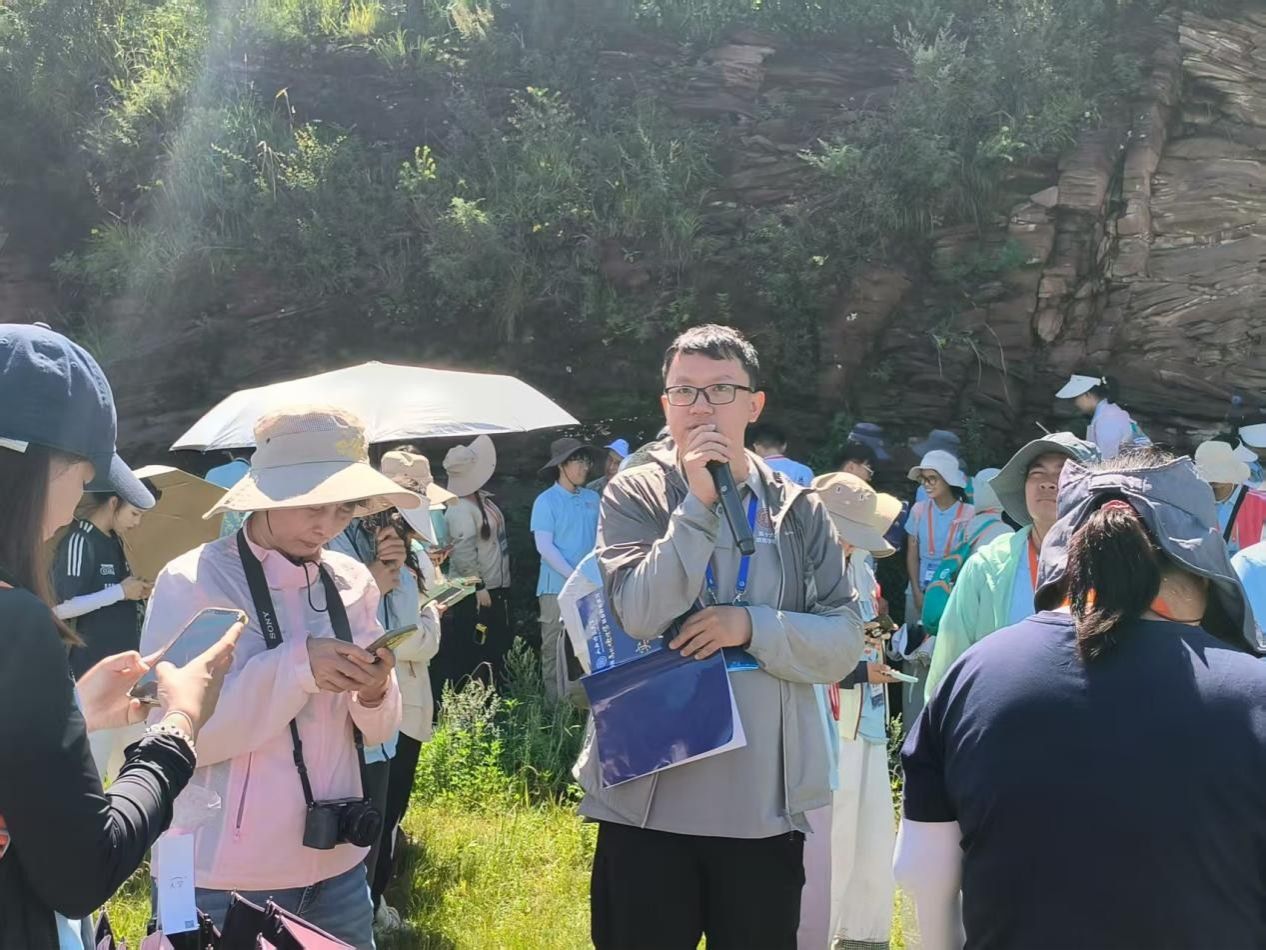 离开汾河源头,实习队来到了天池湖泊群。在一处天然出露的紫红色砂岩地质剖面前,陕西师范大学的王国强老师详细介绍了该地地质构造背景,解释了紫红色砂岩具体成因,并进一步阐述了区域冰川作用-地貌格局-水文过程之间相互影响机制。随后,赵峰侠老师聚焦生态,带师生们辨识黄花荇菜、水葱等水生植物,列举旋覆花、山丹花等陆生植物,展现出湖泊群“水生—陆生”生态多样性。