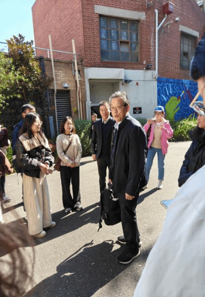 在校园参访过程中,师生们走近了墨尔本大学的标志性建筑——哥特式钟楼。据随行讲解介绍,该钟楼始建于1927年,为纪念在一战中牺牲的墨大学子而建,承载着深厚的历史记忆与校园精神。师生们在钟楼前的草坪驻足观摩,该区域不仅是学生活动的重要场所,也被视为校园文化的核心空间之一。