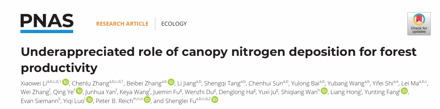 傅声雷教授团队题为Underappreciated role of canopy nitrogen deposition for forest productivity的最新研究成果。该研究依托河南大别山森林生态系统国家野外科学观测研究站,通过一项长达十年的大规模野外控制实验,首次系统量化了“冠层氮沉降”在提升森林生产力和碳固存中的关键作用,解决了该领域长达数十年的科学争议,为准确评估全球森林碳汇潜力、完善气候变化模型、服务“碳中和”战略目标提供了重要的科学依据。