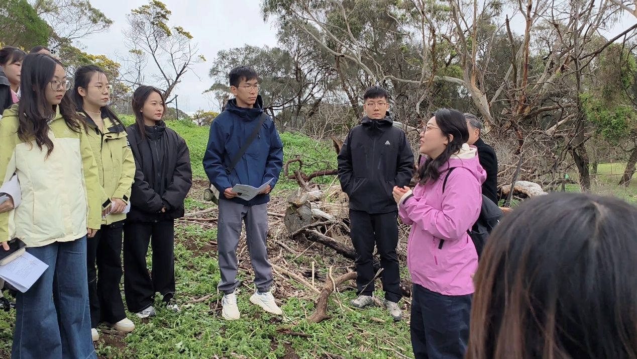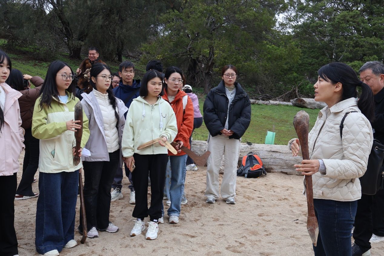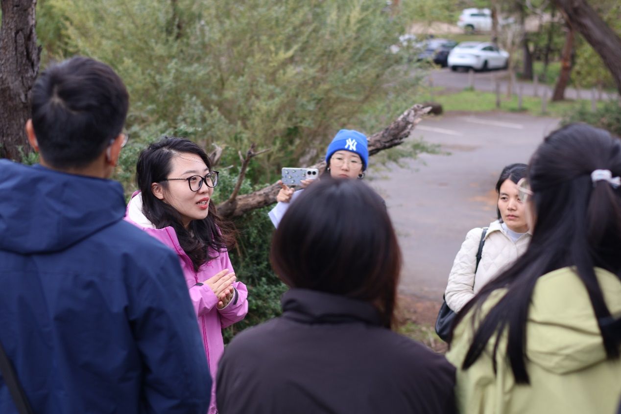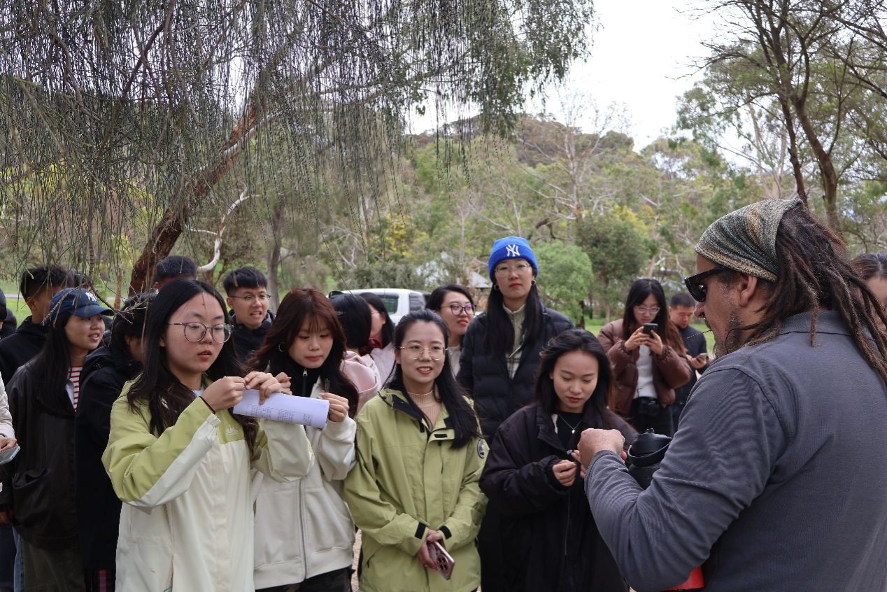 随后,实习队前往塔山野生动物保护区(Tower Hill Wildlife Reserve)——一座位于古老火山口的自然保护地。抵达后,带队老师朱文博首先现场开展了土壤地理学的实地教学,引导学生亲手触摸感知土壤特性,深化大家对当地成土过程与地理环境的理解。活动过程中,学生们不仅近距离观察了考拉、鸸鹋等澳大利亚标志性动物,还积极参与原住民文化体验环节。在原住民向导和带队老师的带领下,大家通过聆听传统故事、认识植物用途、观摩狩猎工具演示,从第一视角深入理解了原住民与自然共生的人文传统和生态智慧。最后,带队老师张丽君以当日所见为例,对人地关系理念进行了系统总结与讲解,进一步提升了队员们对人文地理学的现实认知。