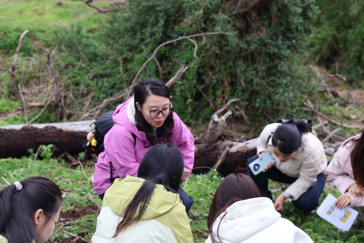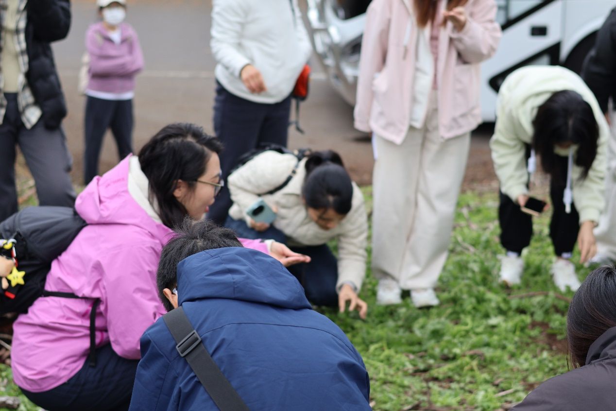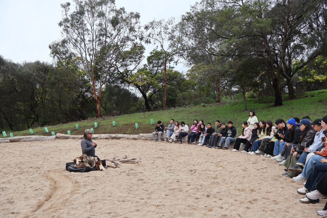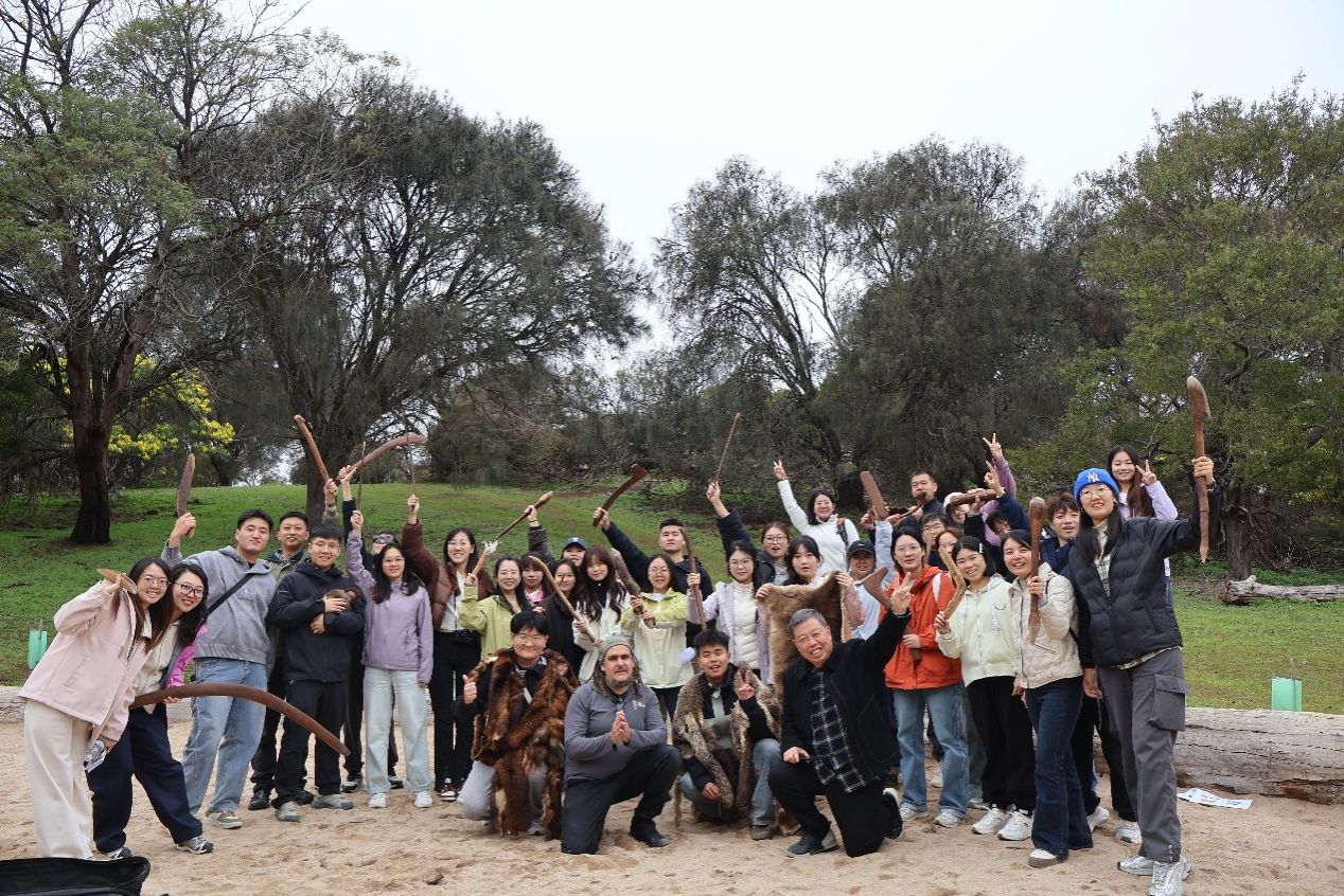 随后,实习队前往塔山野生动物保护区(Tower Hill Wildlife Reserve)——一座位于古老火山口的自然保护地。抵达后,带队老师朱文博首先现场开展了土壤地理学的实地教学,引导学生亲手触摸感知土壤特性,深化大家对当地成土过程与地理环境的理解。活动过程中,学生们不仅近距离观察了考拉、鸸鹋等澳大利亚标志性动物,还积极参与原住民文化体验环节。在原住民向导和带队老师的带领下,大家通过聆听传统故事、认识植物用途、观摩狩猎工具演示,从第一视角深入理解了原住民与自然共生的人文传统和生态智慧。最后,带队老师张丽君以当日所见为例,对人地关系理念进行了系统总结与讲解,进一步提升了队员们对人文地理学的现实认知。