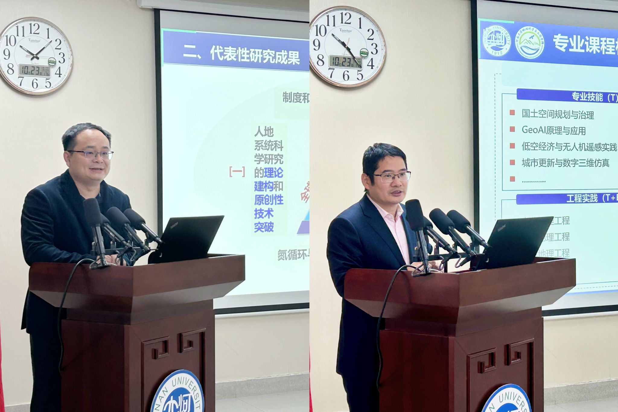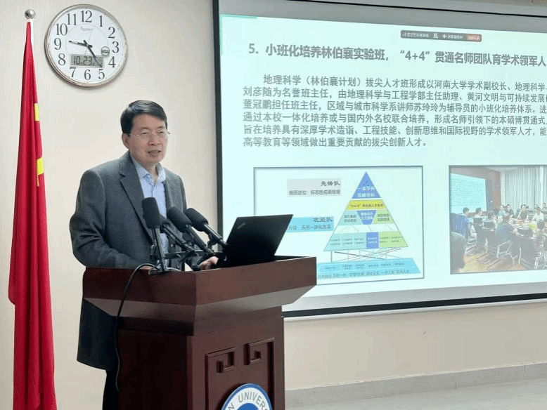 地理学科的发展情况,对“三院一室一中心”的组织架构、学科“36X”体系、空间基准全国重点实验室建设、河南大别山森林生态系统国家野外科学观测研究站功能等进行了详细介绍;围绕“地理科学工程化、地理工程学科化”进行学科建设理念阐述,介绍了国家乡村振兴(兰考)研究院、地理工程小院等地理工程建设举措。最后,他介绍了学部近期的研究成果和建设成效,希望杜德斌教授进一步深入指导学科建设。