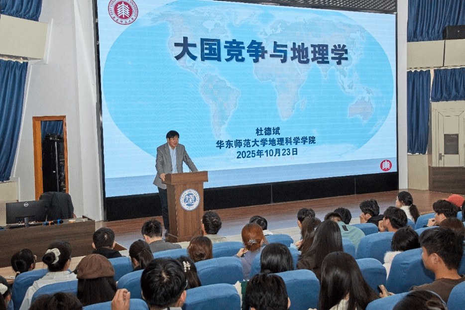 对他的到来表示热烈的欢迎。报告以“大国竞争与地理学”为主题,紧密围绕当前国际格局的深刻变革展开,系统剖析了现代地理学与大国竞争的历史渊源,从世界进入新的大国竞争时代、现代地理学起源于大国竞争、地理科学理论服务大国竞争、新时代中国地理学的使命等四个方面进行了详细阐述。在理论重构方面,他指出新时代中国地理学需要超越传统地缘理论中的零和博弈逻辑,将“生存空间”的竞争思维转化为“共生空间”的合作理念,将“心脏地带”拓展为生态与发展的地理枢纽,为全球治理提供指引。在学科创新方面,他指出要深化世界地理学科建设,打造“中国发展全球变局”交叉融合课程与动态教材体系;依托“一带一路”实践平台,开展地缘政治分析、跨国项目模拟等实战教学,着力培养兼具地理空间智能、国际政经洞察力与战略决策能力的复合型创新人才。在范式转型方面,他指出要聚焦大国博弈关键区、“一带一路”区域,深化区域国别研究,推动研究范式从静态描述“区域差异”转向动态追踪“区际联系”,挖掘不同地区在全球网络中的共生价值为跨区域合作和治理提供学理依据。在强化地理学现实作用方面,他引用胡焕庸先生的“地理学研究既要用‘显微镜’,横察中国现世;更须用‘望远镜’,纵观世界大势”和《世界地理大会宣言》的“面对百年未有之大变局,中国地理学人肩负新的历史使命,应树立更加宽广的世界眼光,赶上时代,引领时代”等内容,认为中国地理学不仅要为国家的全球战略与安全提供智力支撑,更要为构建人类命运共同体贡献学科力量。报告最后,杜德斌分享了国内在世界地理与区域国别研究领域的前沿进展,展示了已上线的全球创新研究网站,提出了全球创新策源地图平台的研究思路与应用前景。