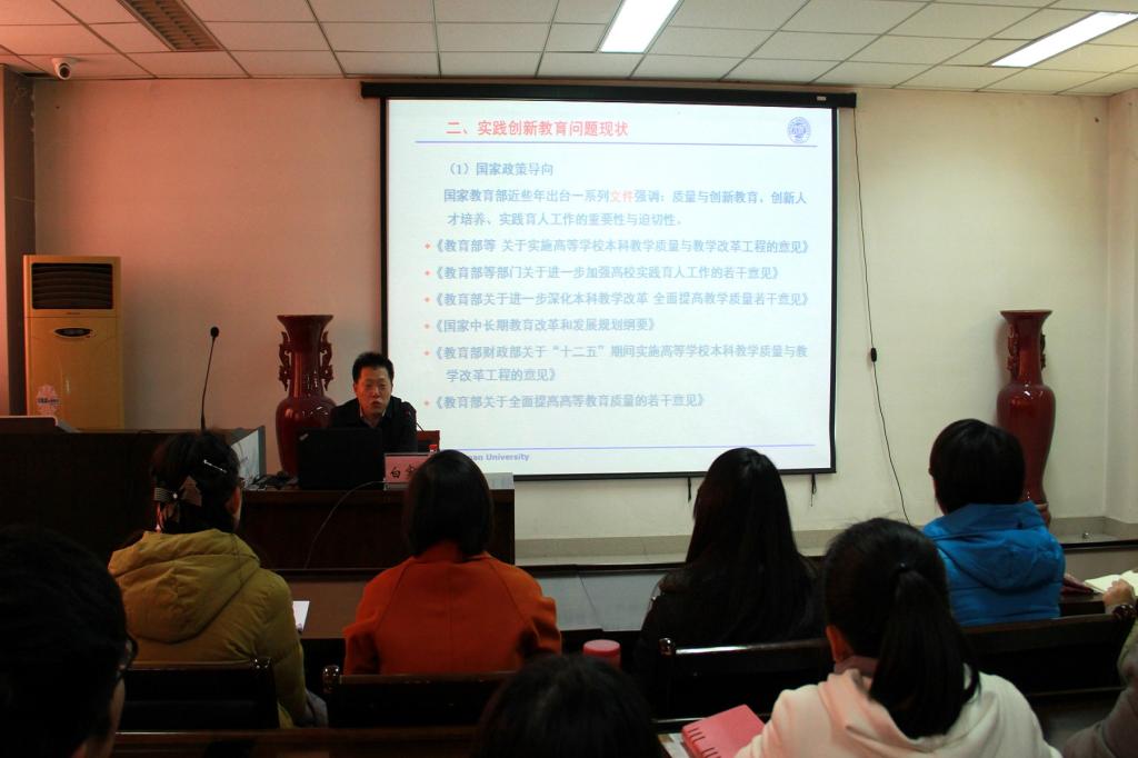 11月23日,白宪臣结合大学生创新创业训练计划项目做了报告。他指出,大学生创新能力培养和实践教学建设是对学生课堂之外能力的有效补充,学院应当实时修正培养目标和政策,以问题和课题为重点,做到课堂与课下相互补充、校内与校外相互联动的实践教学新模式与新机制。他详细讲解了大创项目应如何申报,在选取作品标题时严禁过大过虚,要注重实际,提前做好准备工作。