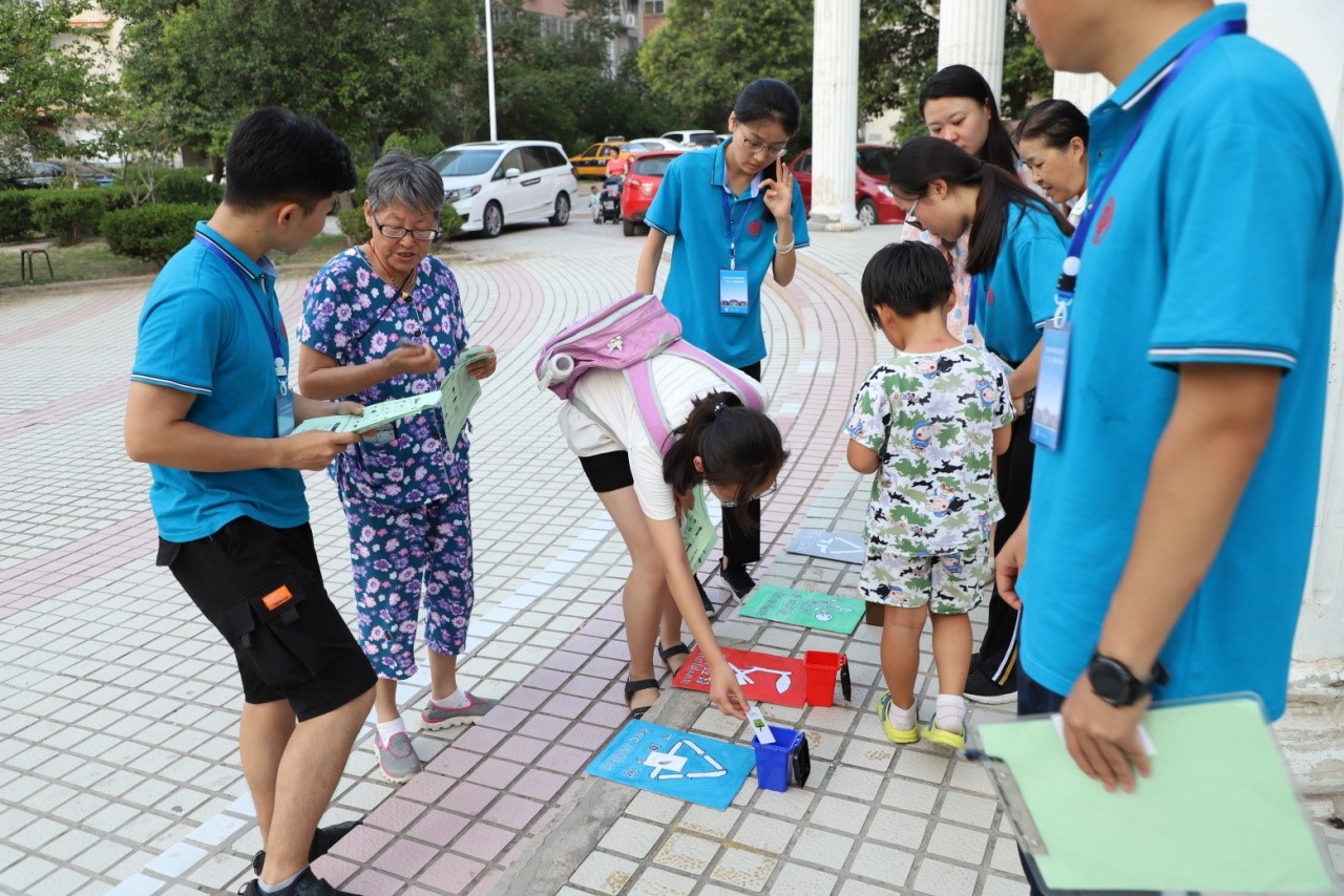 宣传现场,成员们首先向社区居民发放垃圾分类宣传手册并向居民详细讲解生活垃圾分类基本常识,耐心介绍如何在日常生活中对垃圾进行分类和投放。然后,他们指导居民将干垃圾、湿垃圾、可回收垃圾、有害垃圾投入相对应的垃圾桶内,对参与小游戏的居民和垃圾分类正确率高的居民分别进行赠送生活用品的奖励,感谢他们的参与和支持。最后,成员们还请居民在自愿做好垃圾分类的意愿书上签字,期望能达到一定的监督鼓舞效果。