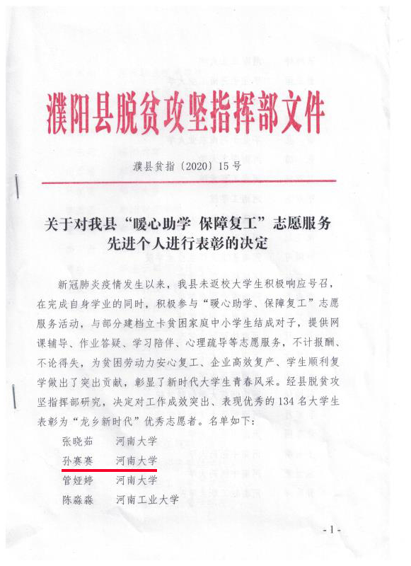 新冠肺炎疫情发生以来,我国疫情防控取得阶段性成果,随着各地复产复工复学进程不断推进,在孙赛赛的家乡濮阳县,却有这样一群孩子陷入困境:许多贫困家庭的孩子由于父母复工,独自在家的他们无法正常完成课业。在濮阳县政府的号召下,众多高校大学生加入了当地政府的“暖心助学,保障复工”志愿活动,为贫困学生提供网课辅导、作业答疑及学习陪伴等志愿活动,孙赛赛就是活动的志愿者之一。