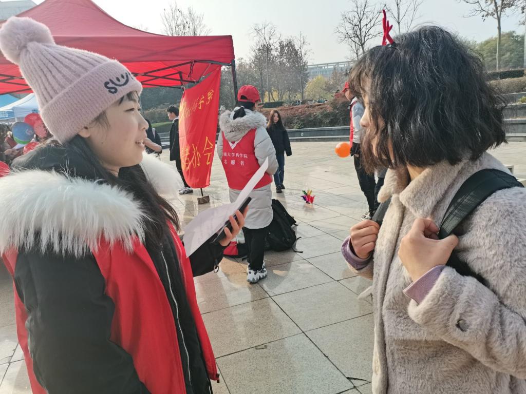 冬日的早晨寒冷难耐,却仍可清晰地看见志愿者们脸上洋溢着的笑容。他们积极且认真地准备着展板、奖品、游戏用品等。活动正式开始后,志愿者们的热情高涨,耐心地向参与活动的同学介绍游戏规则,部分志愿者更是主动走近来往的同学,热情地向他们宣传环境与规划学院的特色活动。