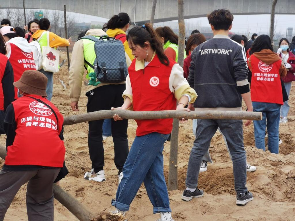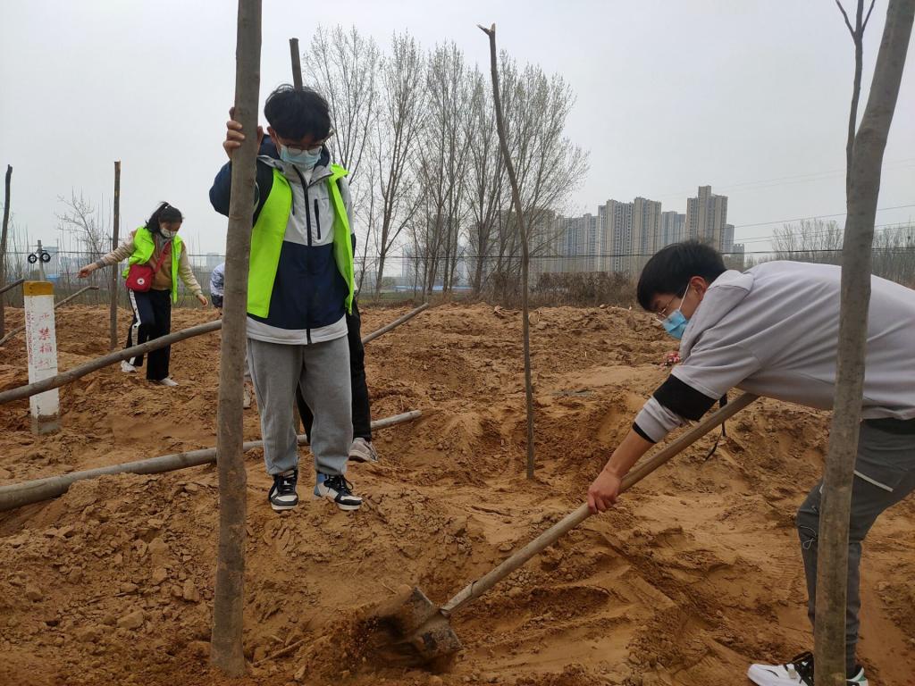 当日下午,志愿者们穿上马甲,有序到达活动地点。开始植树前,大家虚心地向现场的专业人员请教植树技巧。活动过程中,同学们自主分组,团结协作,搬运树苗,扶持树干,用铁锹填土,用脚将土踩实,一个个热情高涨、干劲十足,渐渐地,从最初的动作生涩到后来的游刃有余,植树的效率大大提高。看着一棵棵树苗整齐地站立在风中,虽然衣服沾上了灰尘,但他们的脸上洋溢着满足的笑容。植树完成后,大家整理工具,合影留念,随后大家一起乘坐公交车安全到达学校,留下了一段快乐时光。