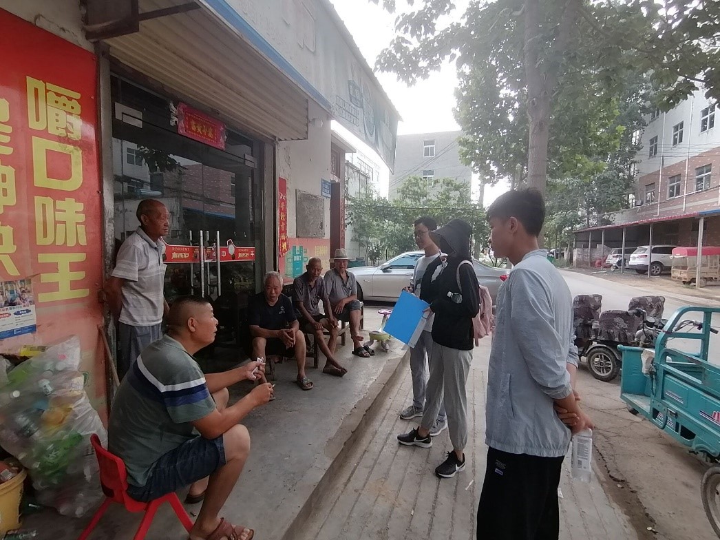 7月15-16日,调研团分别前往位于黄河滩区的柳园口乡牛庄村及大辛庄村开展实地调研活动。柳园口乡位于开封市北部,紧临黄河南岸,主要种植作物为水稻、玉米、小麦、大豆等,由于其地理优势及政府政策扶持,家家户户的地头上都安装了抽水泵,为村民灌溉农田节约了许多人力物力,带来了许多便利。调研团成员根据设计好的问卷,对村民们种植的作物种类、作物产量情况等农业中的相关问题进行了访谈式的调查。