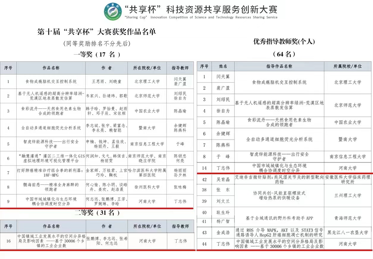 地理学科优势,应用耦合协调度模型、空间分析技术等进行市域尺度下人-地耦合关系的测度和评价,得出具有科学性、创新性、前瞻性的观点,形成了科技论文《中国市域城镇化与生态环境耦合协调度时空分异》,获得全国一等奖,丁志伟老师荣获优秀指导教师。此外,由张鹏博、李志远、张希阳、何志远组成的研究生团队提交的作品《中国镇域工业发展水平的空间分异格局及影响因素——基于30006个乡镇的工业企业数》荣获全国二等奖。