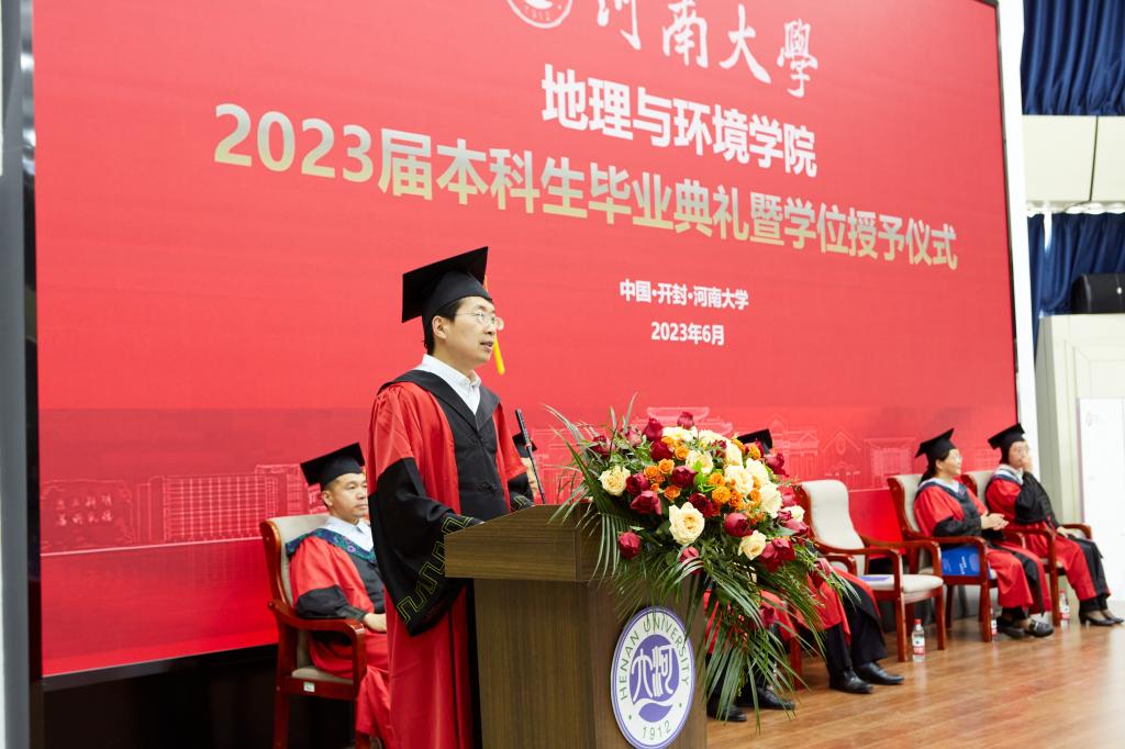 副校长、地理与环境学院院长傅声雷,地理与环境学院党委书记乔家君,副院长翟秋敏、赵威、邱永宽,教师代表谷蕾出席典礼。学院专业教师代表,院党委办公室、行政办公室、教务办公室相关老师,各年级辅导员和2023届全体毕业生参加典礼仪式。仪式由学院党委副书记徐小军主持。