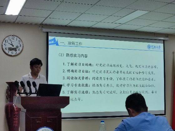 会上,韩冬老师首先讲述了野外实习的重要意义。他提出城乡规划实习是专业性更强的实习工作,野外考察和调研是促进理论与实践相结合的桥梁,是学生们检验课本知识、拓展实践能力、体验规划编制的重要途径,也是学生们磨练意志、培养团结精神的重要手段。接着,结合对巩义市康店镇发展现状的介绍,强调规划前期调研的核心是“分析现状、找到问题,解决问题”,并指出这是我院首次围绕巩义市康店镇开展实地调研,提醒学生们在调研前要对相关材料进行充分学习与认真分析,不要打无准备之仗。会议的最后,韩冬老师对包括城乡规划讲座、康店镇实地实习、业内实习在内的日程安排进行了详细讲述。在此期间声明了实习要求,并强调“安全是重中之重”,介绍了实习行程中各个环节应遵守的纪律,告诫同学们未经允许不要私自外出、不要擅自下河、注意防暑降温、注意饮食安全等。