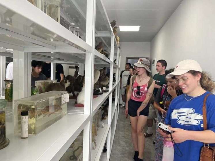 随后,学生们参观了研究站的标本室和实验室。在标本室,琳琅满目的动植物标本引起了同学们极大的兴趣,他们仔细观察各类标本并认真做记录,积极提出问题并对科学研究成果中的兴趣点展开了讨论。实验室参观环节,学生们近距离接触了前沿实验设备和常规观测设备,了解了各种先进的科研设备和技术,体会到科研工作的严谨细致和工作辛苦,表达出了对科研工作者的敬意。