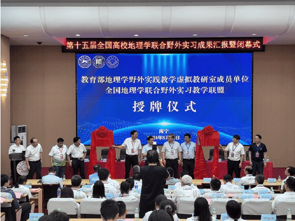 为更好实现跨高校、跨区域交流,助力地理学后备领军人才的培养,闭幕式中举行了建立教育部地理学实践教学虚拟教研室单位、全国地理学联合野外实习教学联盟授牌仪式。全国高校地理学联合野外实习联盟秘书长周立旻教授宣读了授牌文件,郑祥民教授、周立旻教授、胡宝清教授、卢远教授共同完成揭牌仪式。
