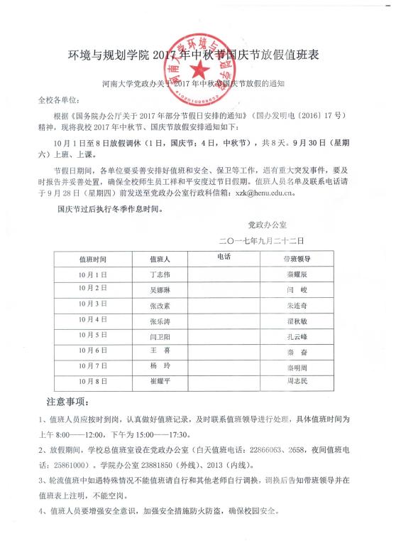 【通  知】环境与规划学院2017年中秋节国庆节放假值班表