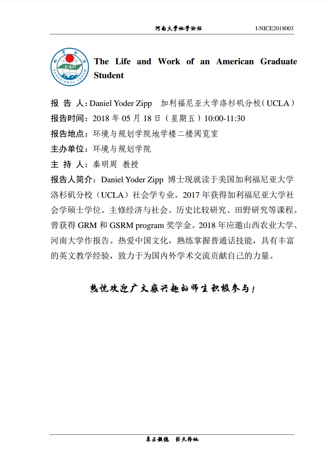 【地学论坛】The Life and Work of an American Graduate Student(时间:5.18,10:00-11:30)