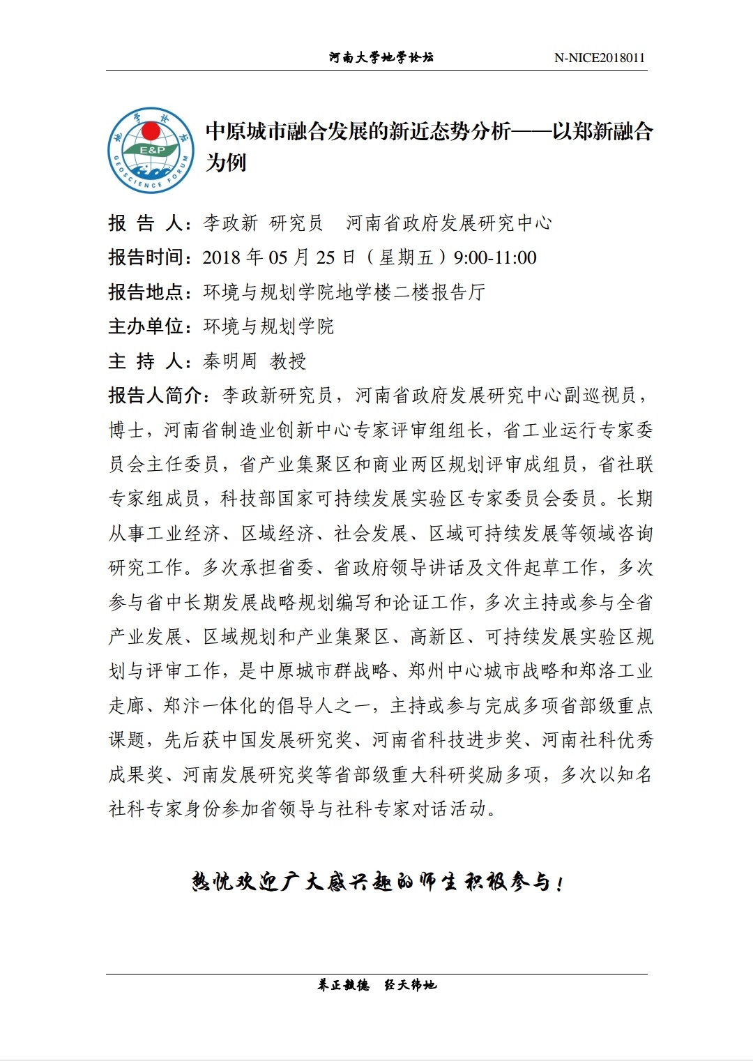 【地学论坛】中原城市融合发展的新近态势分析——以郑新融合为例(时间:5.25,9:00-11:00)