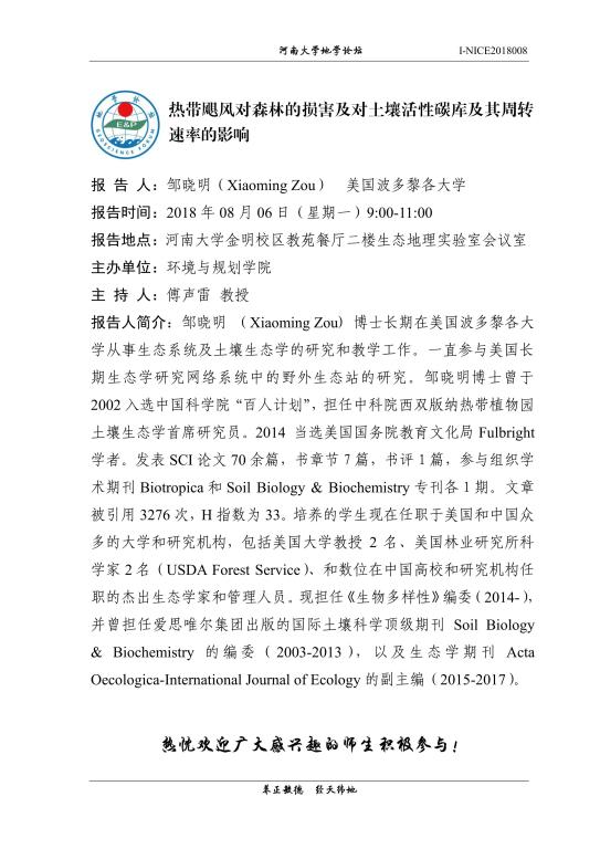 【地学论坛】热带飓风对森林的损害及对土壤活性碳库及其周转速率的影响(时间:8.6,9:00-11:00)