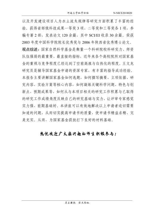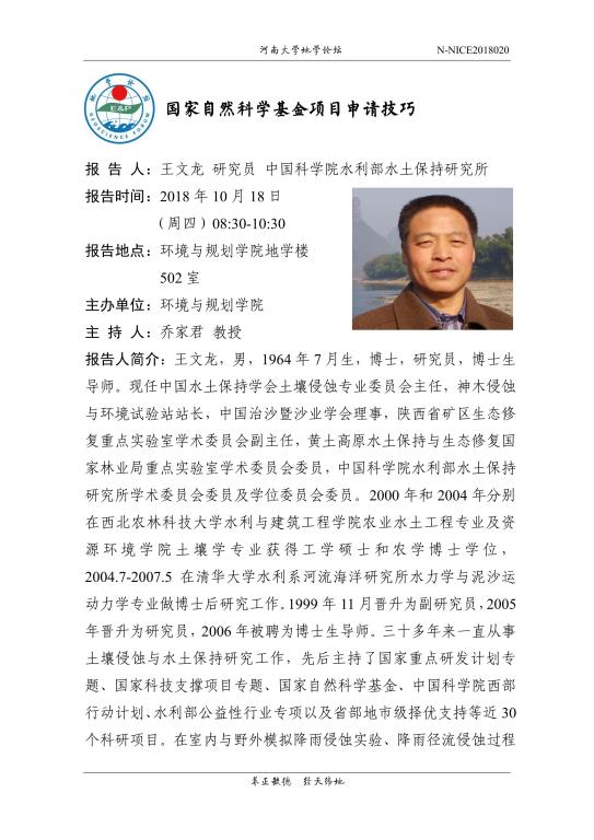 【地学论坛】王文龙:国家自然科学基金项目申请技巧(时间:10.18(周四),8:30-10:30)