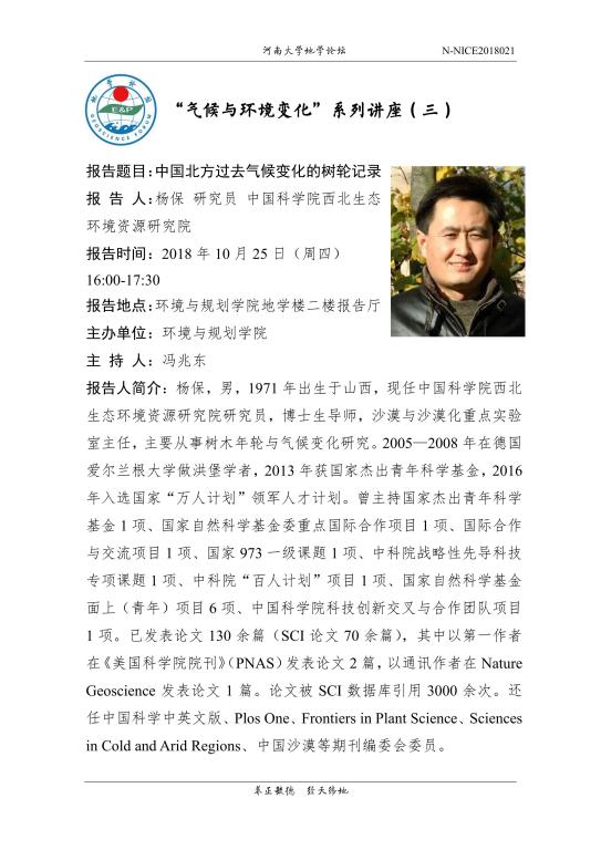 【地学论坛】杨保:中国北方过去气候变化的树轮记录(时间:10.25,16:00-17:30)