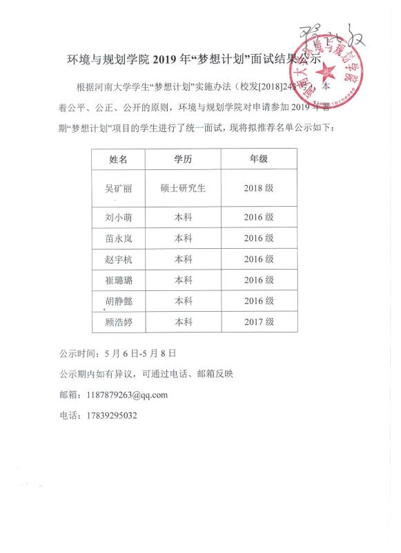 学生“梦想计划”实施办法(校发[2018]243号),本着公平、公正、公开的原则,环境与规划学院对申请参加2019年暑期“梦想计划”项目的学生进行了统一面试,现将拟推荐名单公示如下