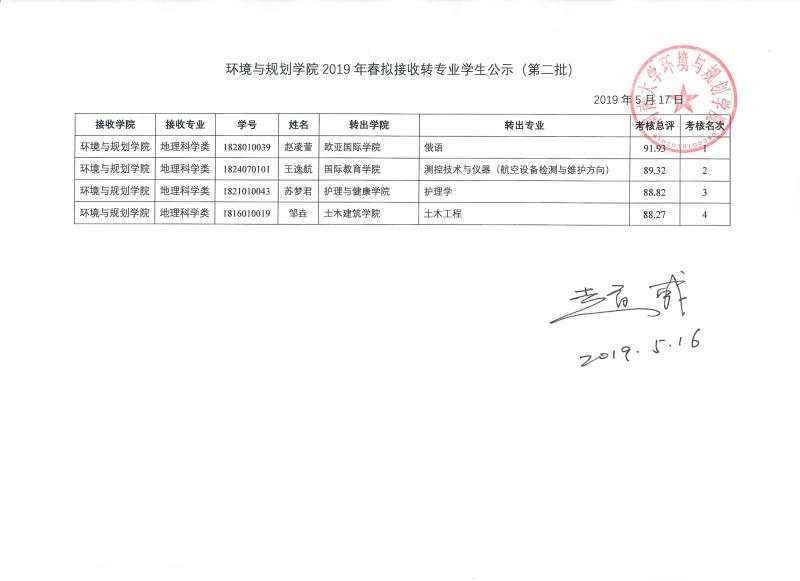 【公  示】环境与规划学院2019年春拟接收转专业学生公示(第二批)