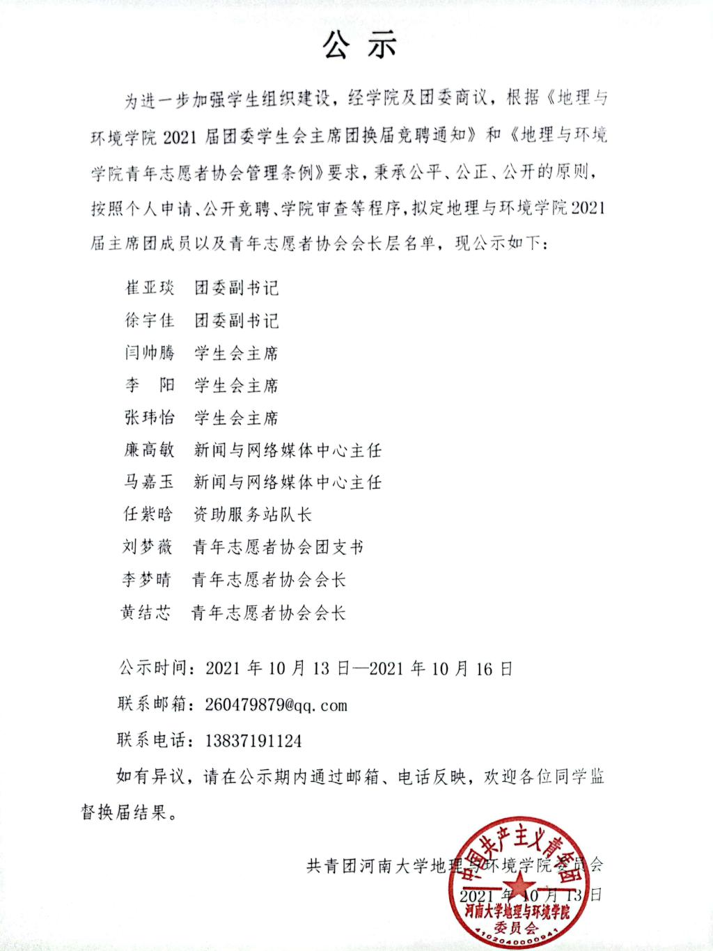 【公  示】地理与环境学院2021届团委学生会主席团及青年志愿者协会会长层任职公示