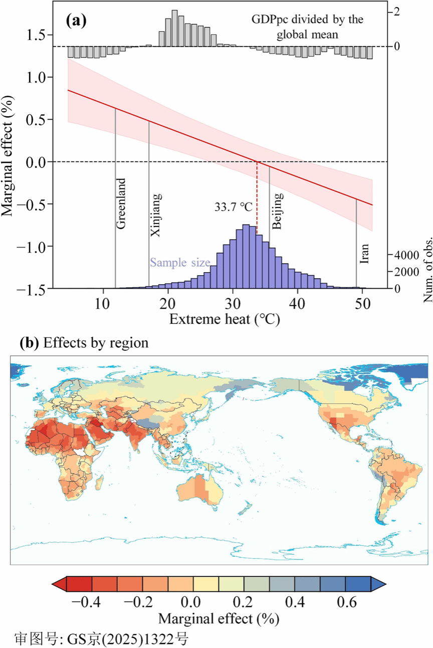 极端高温对经济生产的影响具有显著的空间异质性,当极端高温强度≤33.7℃时,其边际效应为正,反之为负(图2)。极端高温强度较大的区域多为欠发达国家,自身应对气候变化的能力较弱,未来可能遭受更大的经济损失,加剧全球不平衡。投入产出经济关联引致的经济损失随联系强度增强呈现出先缓慢下降、后急剧下降的非线性特征。该研究不仅为极端气候经济损失的精准测度提供了新模型方法,也为全球气候适应策略和供应链韧性建设提供了重要决策依据。