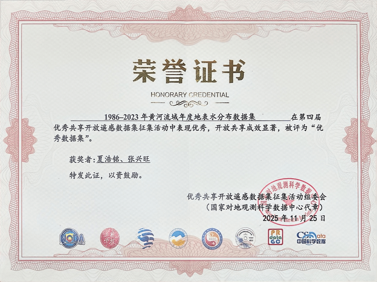 夏浩铭副教授团队发布的《1986–2023年黄河流域年度地表水分布数据集》在众多参评成果中脱颖而出,凭借高质量的数据产品、良好的开放共享机制和显著的应用价值,荣获“优秀共享开放遥感数据集”称号。