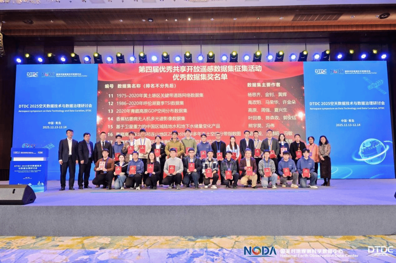 2025年12月13日,由国家对地观测科学数据中心、国家青藏高原科学数据中心、国家冰川冻土沙漠科学数据中心、国家极地科学数据中心,以及《遥感学报》《中国科学数据》《全球变化数据仓储电子杂志(中英文)》《全球变化数据学报(中英文)》等权威机构联合主办的“第四届优秀共享开放遥感数据集征集活动”颁奖典礼在青岛隆重举行。